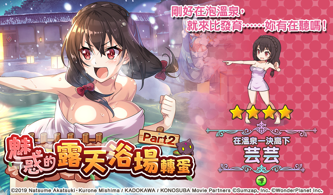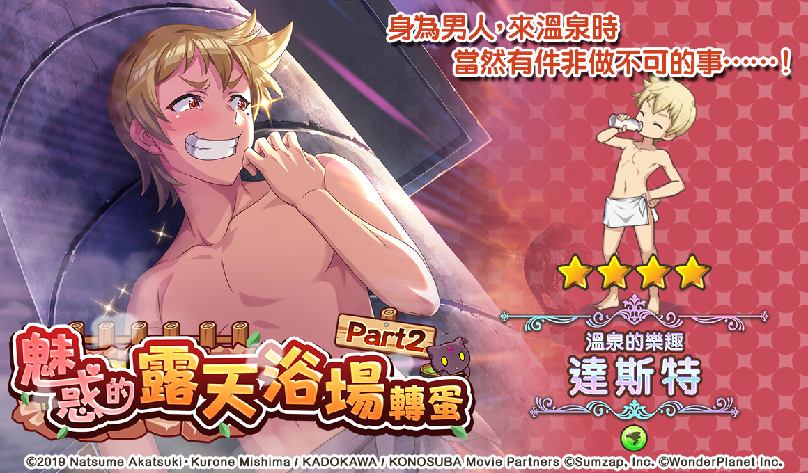 4 月 14 日(三)也將舉辦期間限定的「魅惑的露天浴場轉蛋Part2」。芸芸和達斯特將在露天浴場以★4角色之姿登場!各位玩家可千萬別錯過這次機會,入手期間限定的稀有角色喔!