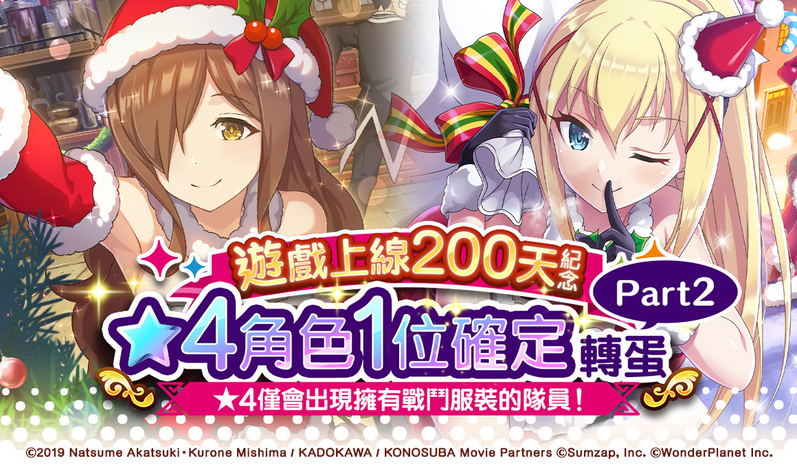 繼前次大受好評,4 月 15 日(四)起將舉辦「遊戲上線200天紀念★4角色1位確定轉蛋Part2」。此轉蛋為只會出現★2 以上隊員,並且必定出現擁有「戰鬥服裝」之★4 隊員的轉蛋。且為盛大慶祝遊戲上線 200 天並回饋上線以來不斷支持遊戲的玩家們,平常需花費 3000 水晶才能抽取的此轉蛋,本次只要 2000 水晶即可抽取。