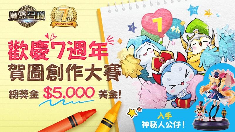 《魔靈召喚》歡慶 7 週年,於今日再推出賀圖創作大賽,只要於活動期間內使用任意魔靈召喚角色畫出 7 週年祝賀圖,將作品上傳至個人社交平台以及加上指定的 Hashtag 並設為公開,即可申請參加活動。優勝的玩家將獲得限量最新「神秘人公仔 1 隻」以及 500 元美金獎金,共 10 名!發揮你的創意,贏得豐富獎勵。
