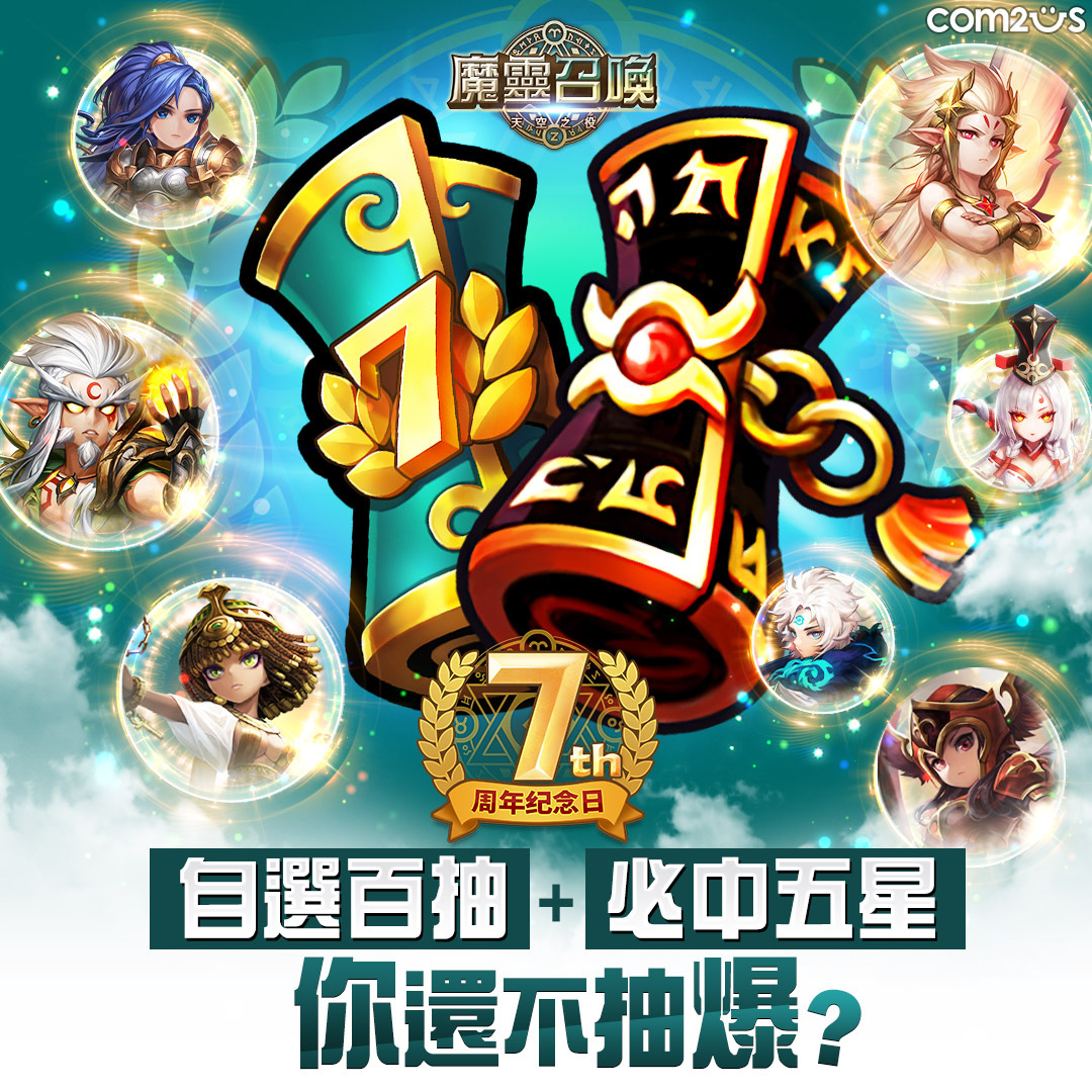 Com2uS 旗下全球人氣手遊《魔靈召喚》正式邁入 7 週年並於今日追加歡慶活動,募集玩家的 7 週年創意賀圖,並且送出總獎金 5,000 美金以及全球限量的「神秘人公仔」。除此之外,《魔靈召喚》7 週年再送自選 100 抽以及必中 5 星超越召喚書,實現你的願望!