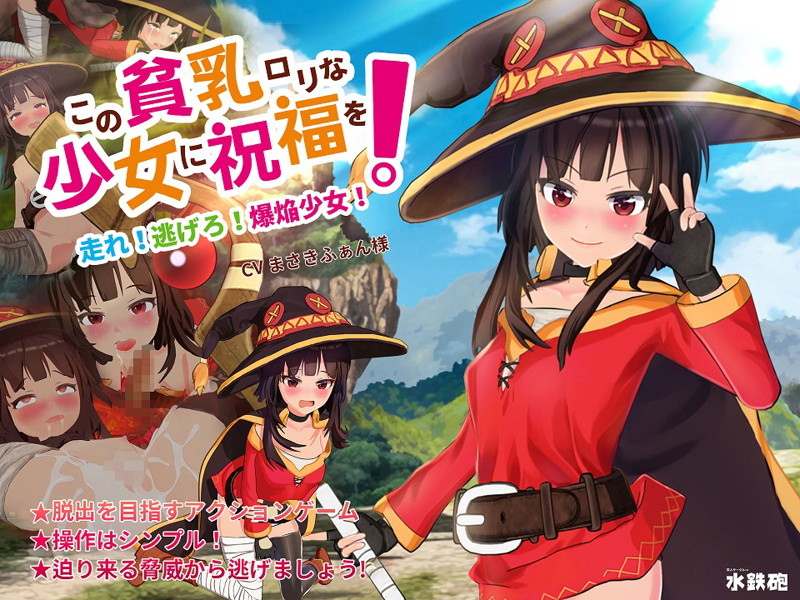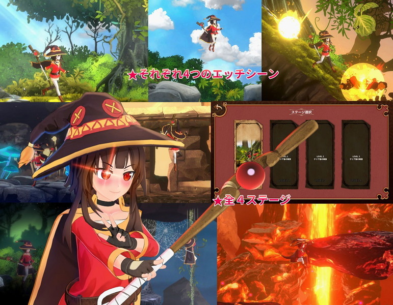 本作為一款取材自人氣作《為美好的世界獻上祝福!》,讓玩家們操作可愛的紅魔族魔法少女,設法逃出關卡的動作遊戲。遊戲操作玩法非常簡單,玩家們只要設法逃開迎面而來的威脅,並在安全的場所釋放爆裂魔法將敵人全部都給打倒即可進入下一關。不過既然是成人向,當然也會有服務玩家的部分;一旦玩家被敵人抓走,就會看到女主角被敵人給做出各種色色的事情,因此是要以過關為優先,或是欣賞H為首要,就看玩家自己的決定!