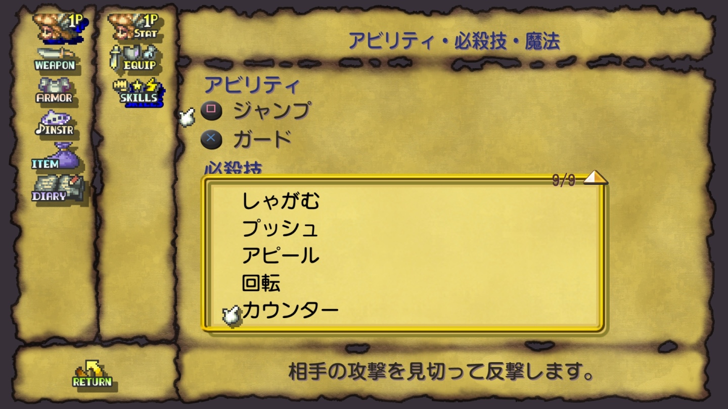 能力和必殺技 只要裝備跳躍、防禦等基本動作並不斷戰鬥,就能學會新能力。而且隨著能力越來越熟練,每種武器都能學會不同的強大必殺技。主角能裝備的武器共 11 種。除了攻擊能力不同,戰鬥時的移動速度和升級時能力值提升量也會隨著武器改變。
