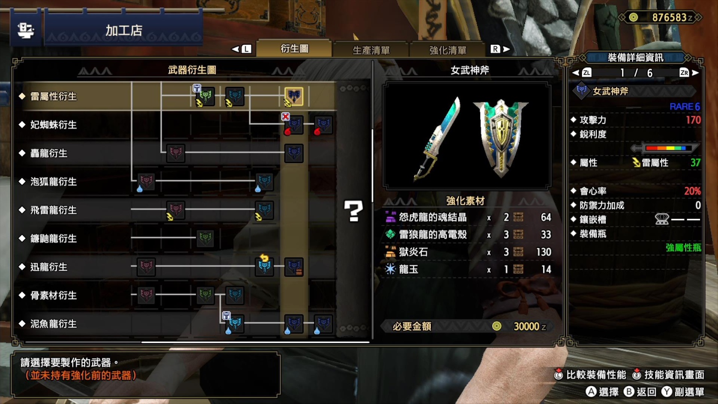 優先級:利刃/業物 選配技能:匠、攻擊力、雷屬性強化、破壞王、心眼,你護石很歐的話弱點特效也不錯 |