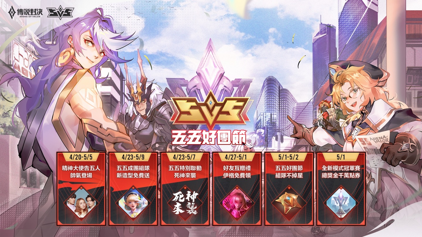《Garena 傳說對決》一年一度的五五好團節,在今年 5 月 1 日與《傳說對決》GCS 職業聯賽冠軍賽一同盛大舉行,多樣活動歡慶品牌節日。除了重頭戲五五好團節特別聯動《BLEACH 死神》,呂布、莫拉、布萊特等人氣英雄化身經典角色登陸傳說戰場外,在當天登入完成活動即可免費領取新英雄「燼滅之眼 伊格」,全新模式「冠軍賽」與五五好團節必備福利「組隊不掉星」將同步登場!