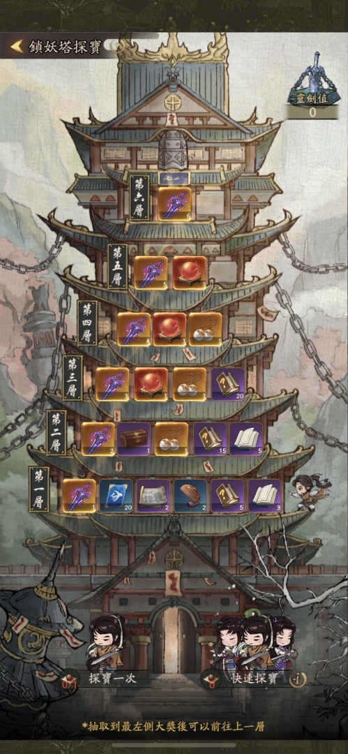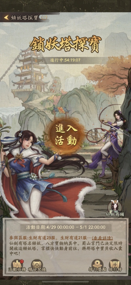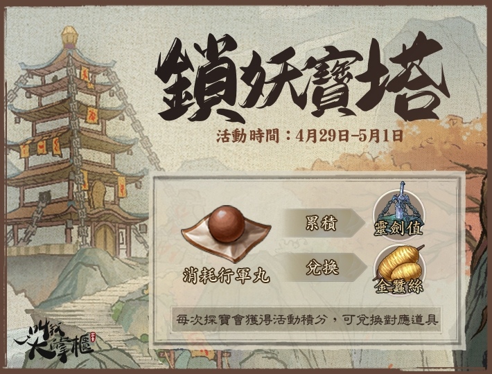 傳說中用於囚禁妖魔的鎖妖塔,於汴京江湖中橫空出世,搖身一變成了一個尋寶聖地。4 月 29 日至 5 月 1 日活動期間,玩家消耗「行軍丸」即可和李逍遙大俠一起御劍飛入鎖妖塔內探寶。鎖妖塔共六層,每次探寶都有概率獲得靈劍和「靈劍值」,累積即有機會獲得神秘的「金蠶絲」!