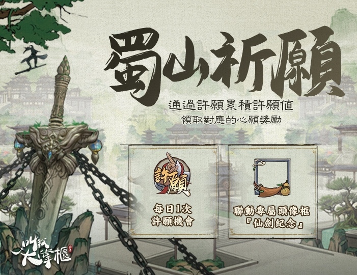蜀山派乃是仙劍江湖中規模最大的修仙門派,凝聚了滿滿的仙氣與好運。4 月 29 日~5 月 13 日活動期間,蜀山許願池將開放給全服所有等級達到 10 級或以上的玩家。玩家設置心願獎勵後,每日都可以在鎮天寶劍前虔誠許願 1 次。累積足夠多的「許願值」後,即可免費領取對應的道具和「仙劍奇俠傳聯動頭像框.仙劍紀念」專屬頭像框。
