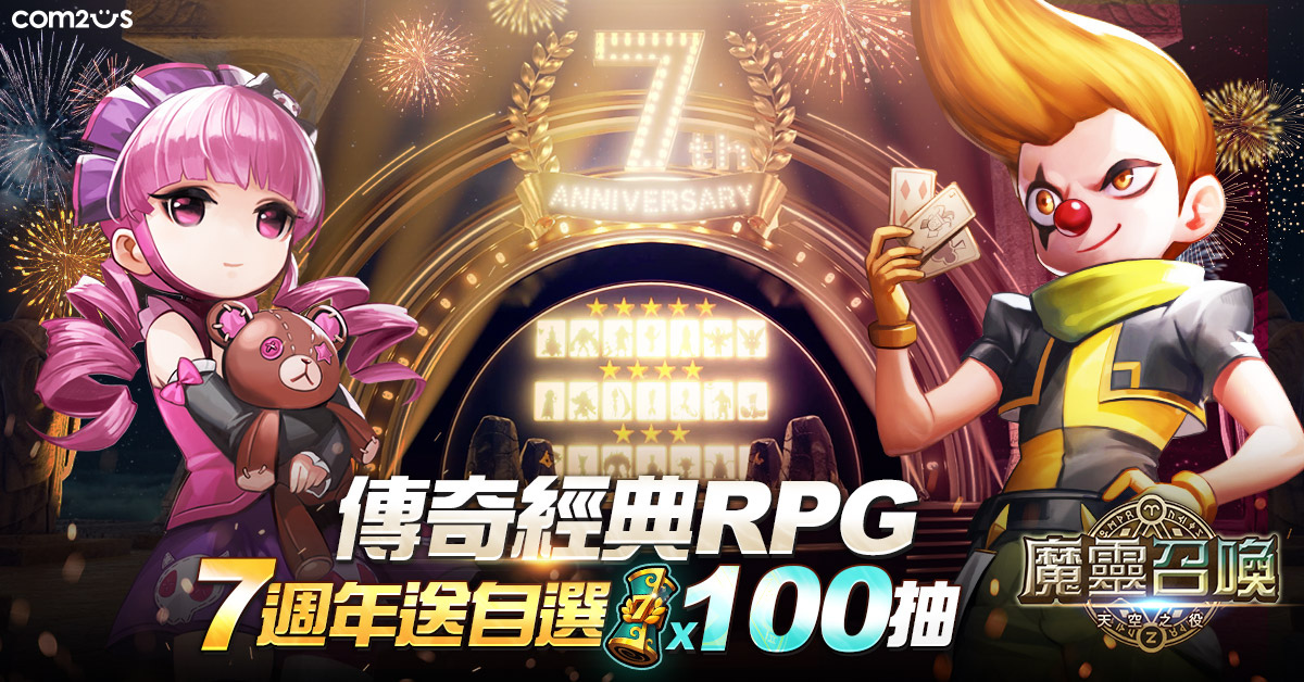 《魔靈召喚》歡慶 7 週年,推出全新 7 週年紀念召喚書!玩家可以使用 7 週年召喚書選擇自己喜愛的魔靈,包含 7 隻 5 星、7 隻 4 星、7 隻 3 星共 21 隻魔靈作為召喚名單。透過 7 週年活動玩家可以免費獲得 100 張 7 週年紀念召喚書,從自己挑選的 21 隻魔靈中隨機召喚出你想要的魔靈!除此之外,7 週年慶加碼再送必中 5 星魔靈的超越召喚書,只要玩家在 7 週年活動期間內消耗能量即可獲得 7 週年紀念幣,並兌換超越召喚書、光暗召喚書以及惡魔怪等超多豐富獎勵,錯過再等一年也不一定有!