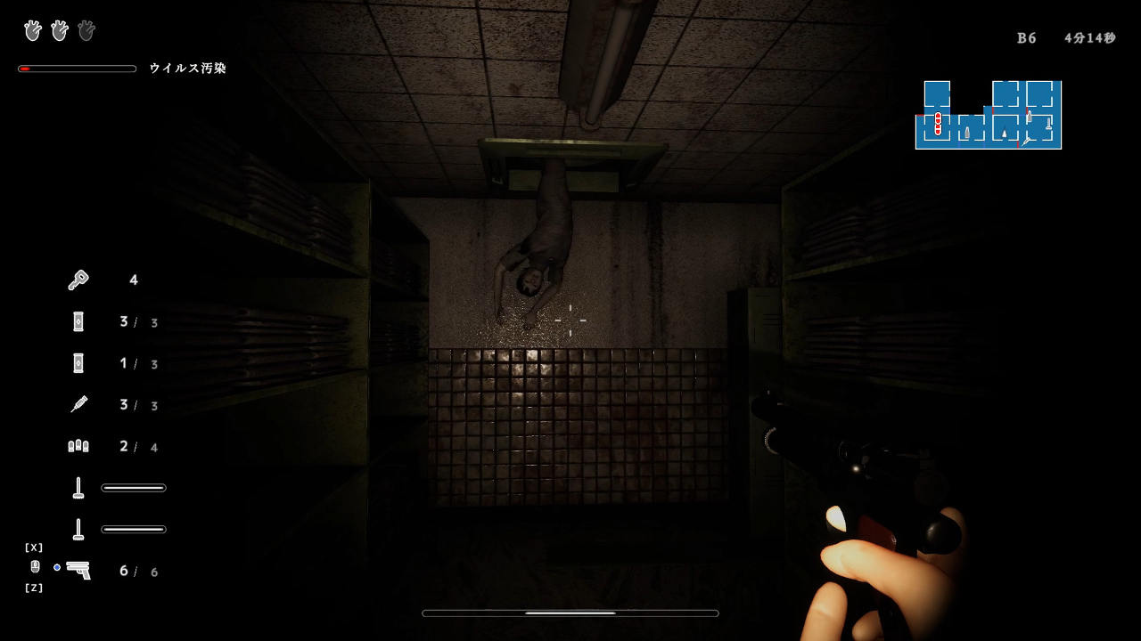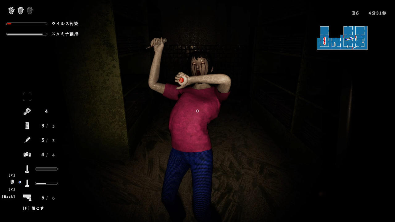 而在醫院裡,受到病毒感染的人們都失去自我在醫院裡四處徘徊著,玩家們需要利用在醫院裡入手的拖把或麻醉槍等作為武器來將之擊退,並在各階層探索收集各種需要物資與鑰匙,才能不斷往下前進找出自己妹妹下落。而感染者們除了會在看到玩家時對玩家發動攻擊外,也會對聲音產生反應,因此玩家們如果隨便亂走動,有可能因此而招來感染者攻擊。加上各種陰暗的畫面演出與恐怖表現,都將會帶給喜歡恐怖遊戲的玩家們全新的體驗與挑戰。