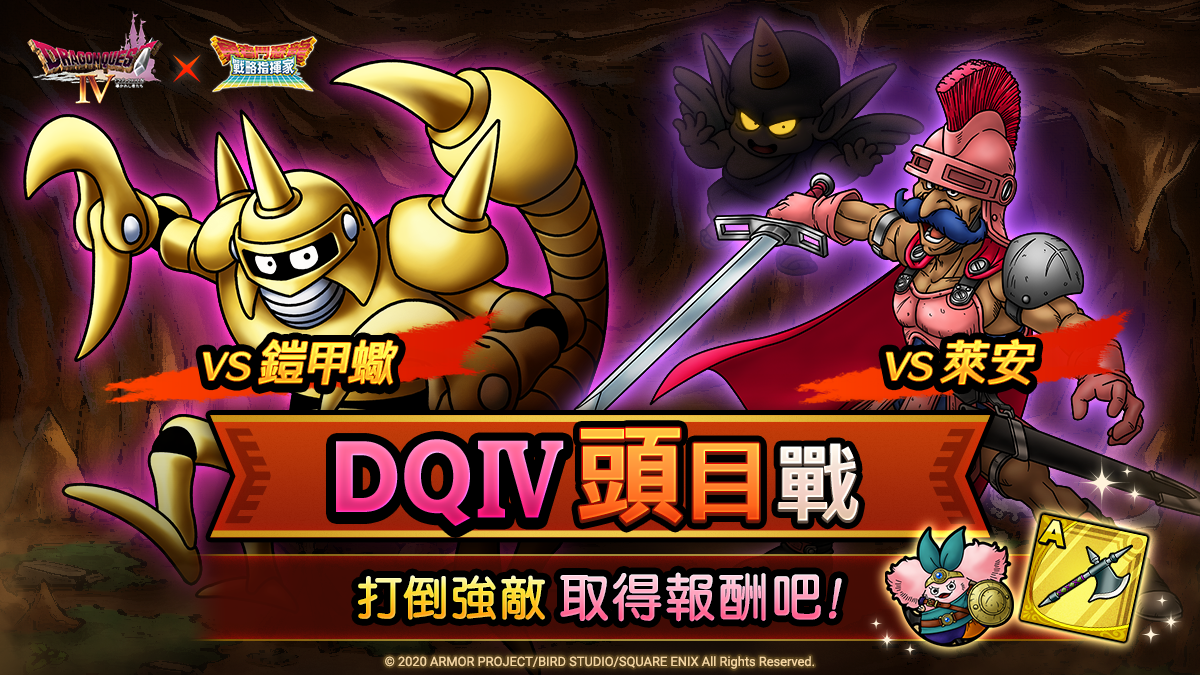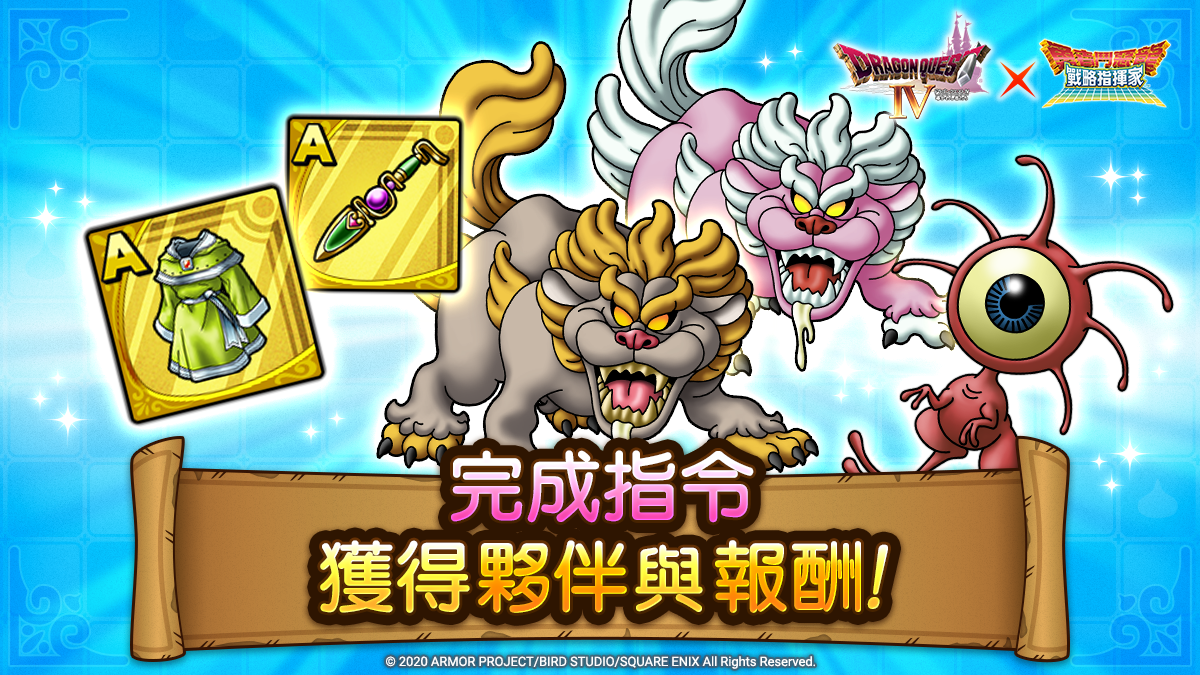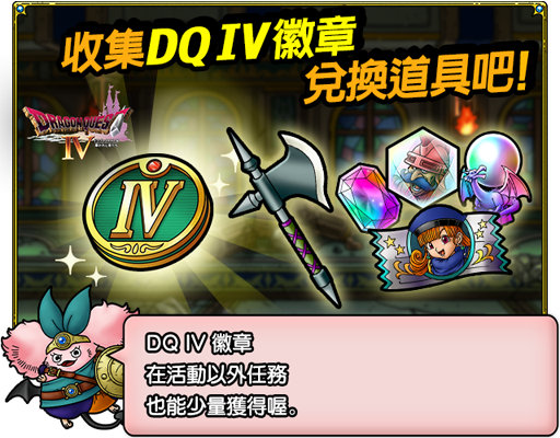 完成活動任務,把「DQ IV徽章」拿到手吧!蒐集到的「DQ IV 徽章」可以去 DQ IV 徽章兌換所,兌換各式各樣的道具。從各活動任務報酬中,可獲得S級裝備「皮薩羅之爪」和 A 級裝備「戰斧」等獎勵。此外通過完成期間限定的「活動指令」,還能讓首次登場的「魔犬斯伯納克」、「衝鋒大眼球」成為夥伴,以及取得「閃避之衣」等 A 級裝備!