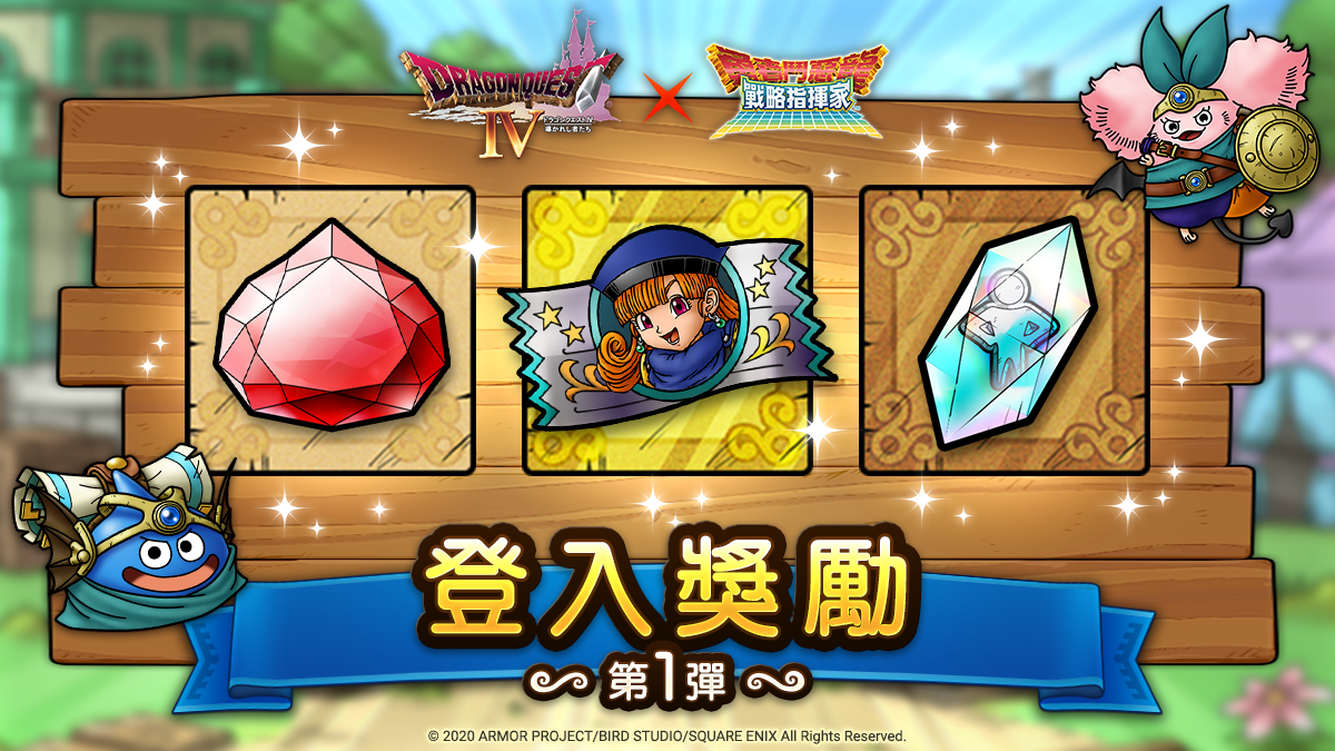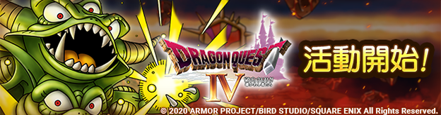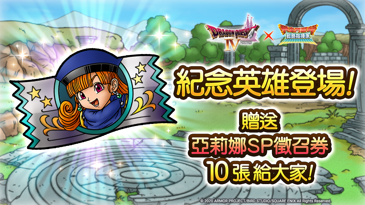 慶祝 DQIV 活動開始,在活動期間只要登入即送寶石、特殊徵召券、英雄系碎片等多樣好禮,不要忘了每天登入冒險!另外,為紀念新系統「英雄」登場,更額外贈送「亞莉娜 SP 徵召卷」給所有大師。