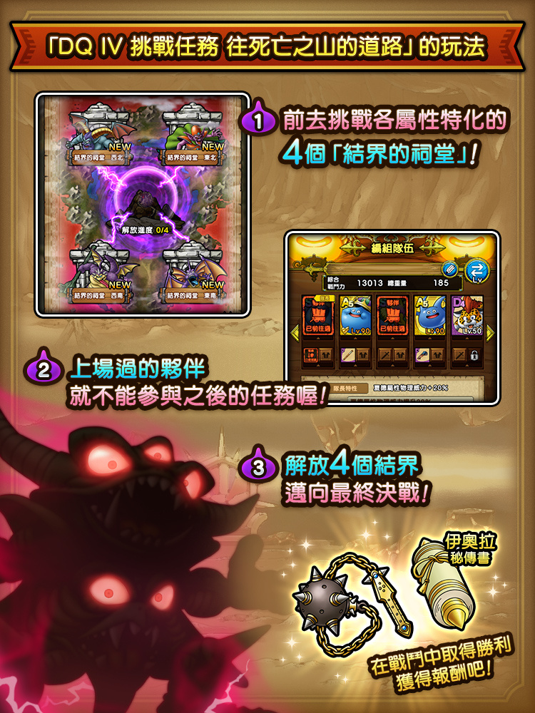全新型態「挑戰任務 往死亡之山的道路」登場!以 DQIV 中的死亡之山為舞台,要讓玩家以培育的夥伴們進行挑戰的總力戰任務。死亡之山的四周設有 4 個結界,通過所有「結界的祠堂」的關卡後,死亡之山便會開放。結界的祠堂中,會出現各自擅長不同屬性特技的頭目,以及會使用施加異常狀態特技的敵人,並且已於各通過關卡中出場過的「夥伴」和「裝備」就不能再用於其他關卡。所以想要通關就需要多培育具備有利的屬性抗性及異常狀態抗性的夥伴,並且在編組隊伍時也必須多加思量,是全新型態的挑戰任務!