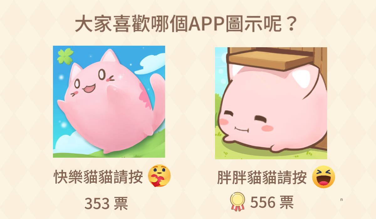先前於官方粉絲團舉辦了「APP 圖示票選」,分為「快樂貓貓」與「胖胖貓貓」兩種版本,讓玩家可在貼文下方留下心情來進行票選,最終結果為 353 票對上 556 票,「胖胖貓貓」贏得最多票數獲選為最終的 APP 圖示版本。