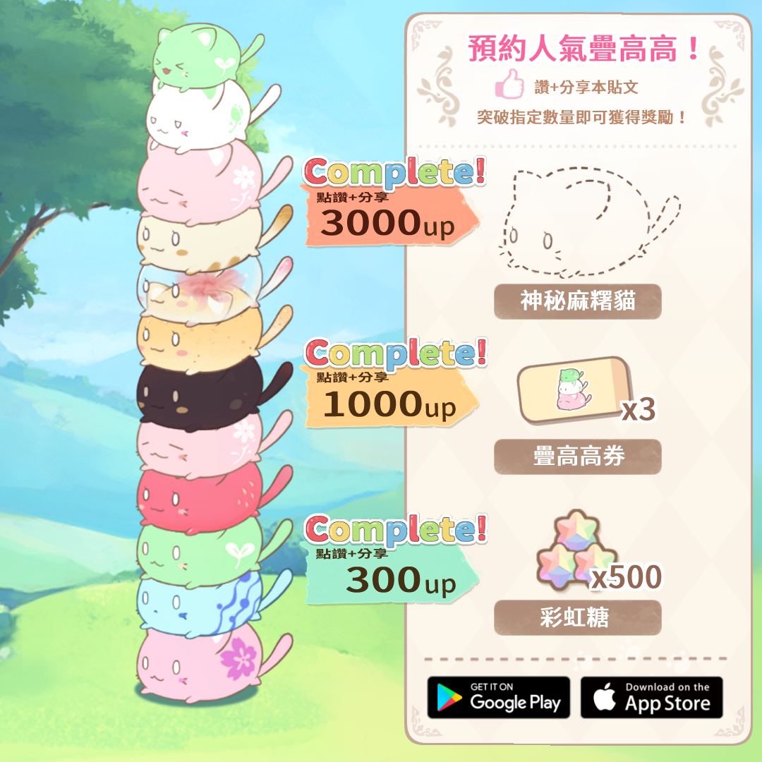 先前在官方粉絲團舉辦的「預約人氣疊高高」已圓滿達成目標,下載遊戲中即可獲得「神秘麻糬貓、疊高高券x3、彩虹糖x500」,領取時間為 5/17 ~ 6/26 期間限定。