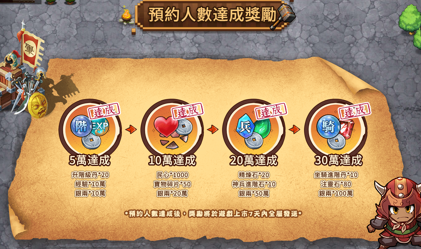 官方還宣布遊戲開放事前預約截至今(20)日,預約人數已達到30萬里程碑,所有的獎勵目標都成功解鎖,銀兩*180 萬、經驗*10 萬、升階級丹*20 等豐富的養成資源將會在 7 天內全服發放給所有玩家,而成功預約的玩家可以額外獲得「開荒小軍師」限定稱號,此外邀請好友預約的獎勵元寶*288、元寶招募令*10 以及頭像框(最強武將)也將同步發放,玩家不妨趁著預約獎勵發放時間內加入遊戲,獲得資源輕鬆開局。