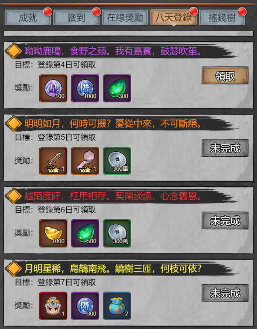 福利2、八天登錄:玩家登錄遊戲能夠獲得額外的八天登錄獎勵,除了可以獲得高稀有度紅將「馬超」,還有元寶,銀兩,招募令,橙裝,升星丹,進階丹等養成材料。