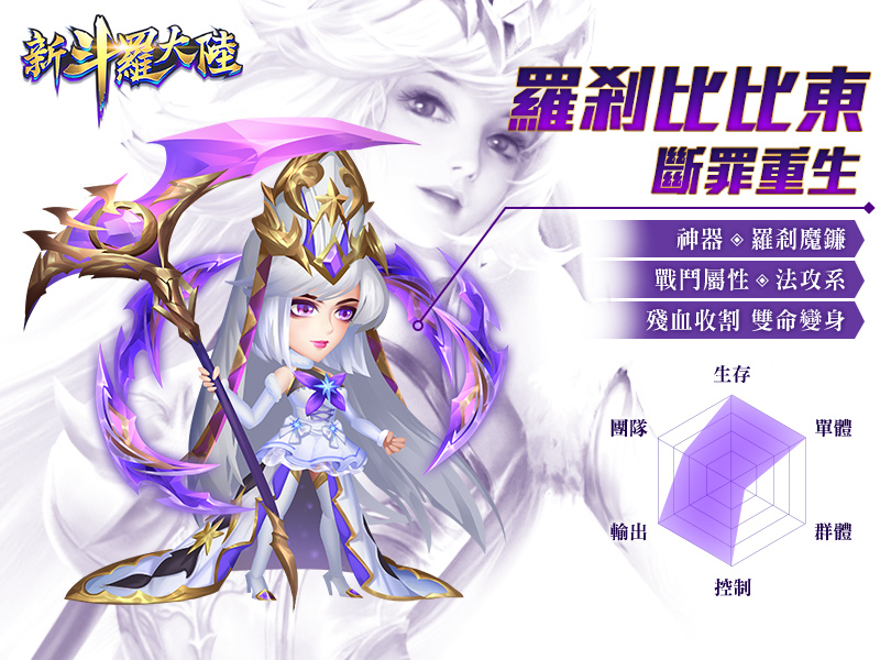 比比東在完成羅剎九考後,成功突破為一級神祇羅剎神,如今,她以 SS+ 魂師的身份降臨《新斗羅大陸》,其八字定位為「殘血收割,雙命變身」。繼承羅剎神力量的她具有不死之身,不僅在戰鬥中可以免疫一次死亡,還能獲得羅剎神真身附體的效果,變身後大幅度提升攻擊力和雙防,同時普攻附帶吸血效果,大幅增加續戰能力。