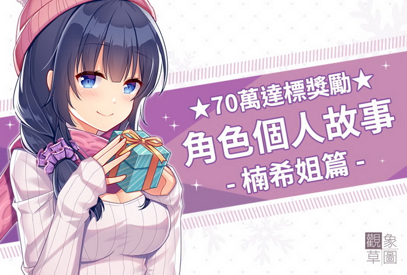 為了滿足玩家的期待,製作團隊在最新公開的 70 萬達標獎勵中,公布將為遊戲中的人氣角色「楠希姐」製作特別篇章。特別篇為獨立於本篇之外的角色個人故事,除了有新角色登場之外,主要攻略對象的楠希姐也將會有新的立繪服裝與遊戲 CG。
