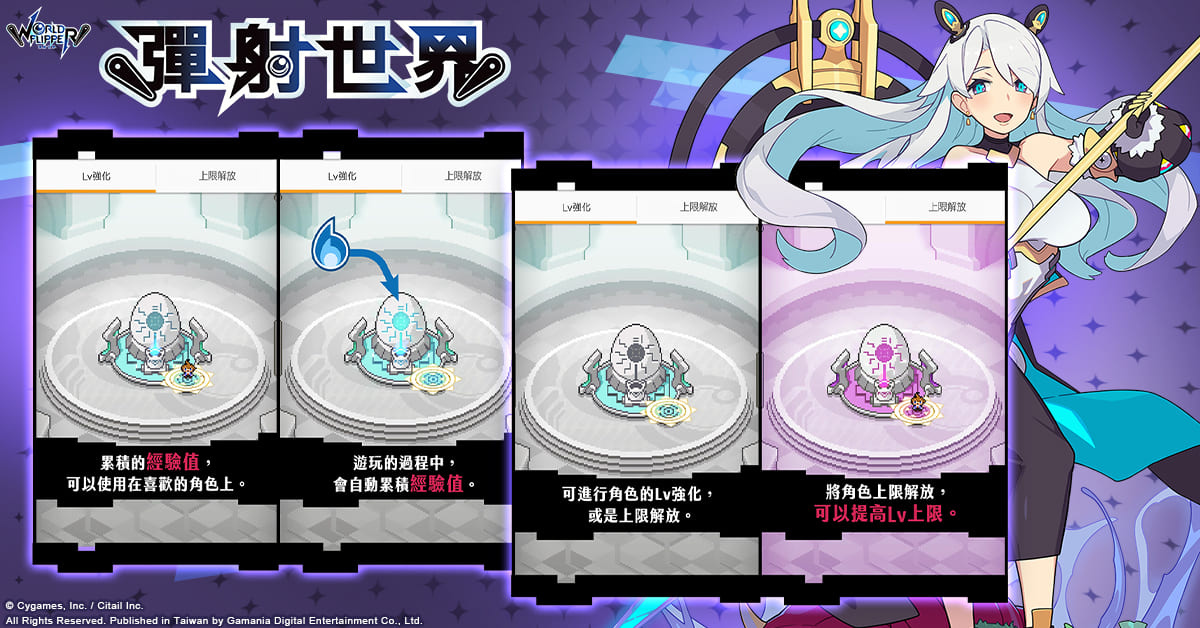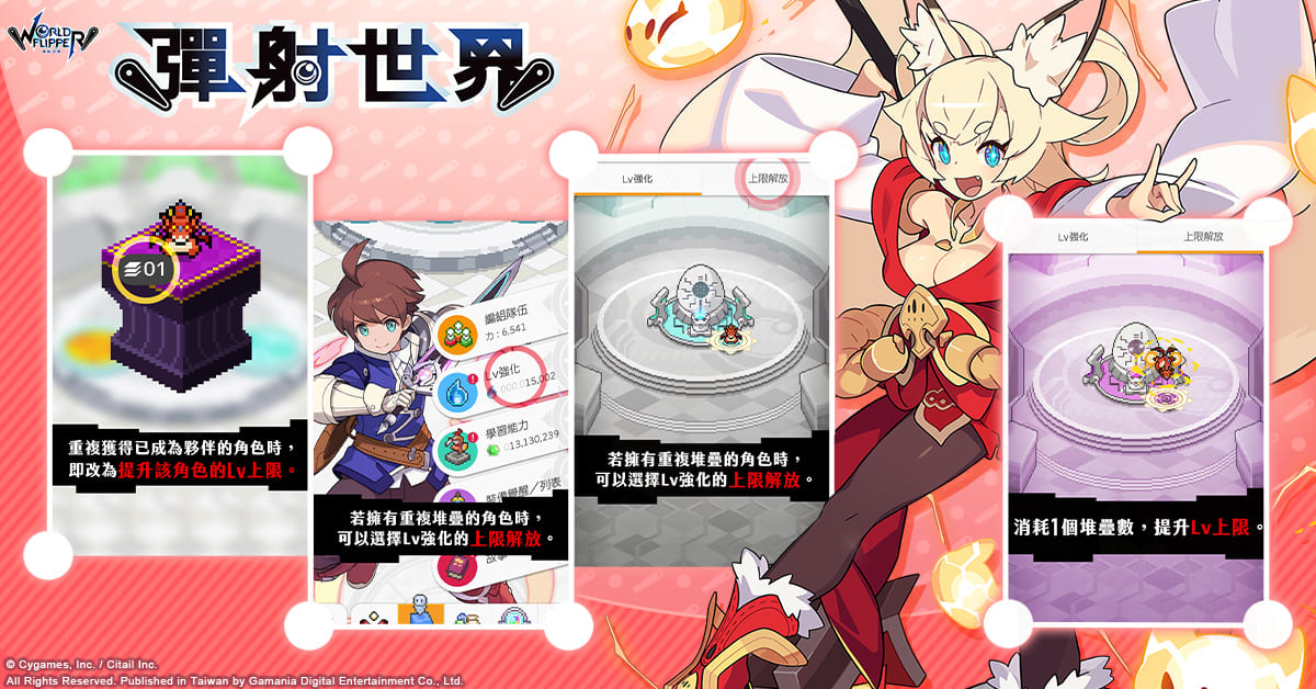 《彈射世界》玩法設計以「彈珠台」為基礎,並加入冒險劇情、角色培養、戰鬥系統等 RPG 元素,是能夠輕鬆遊玩的全新風格動作 RPG 遊戲。遊戲承襲了 Cygames 旗下作品的精緻畫風,每位角色都可在進化後欣賞到與進化前不同的全新造型,玩家將於遊戲中與各式各樣的角色相遇,並展開華麗的冒險。以下將為大家介紹一些本遊戲的系統及玩法。