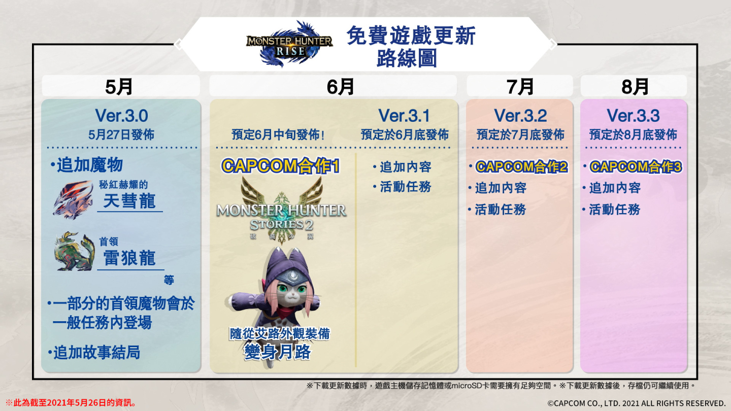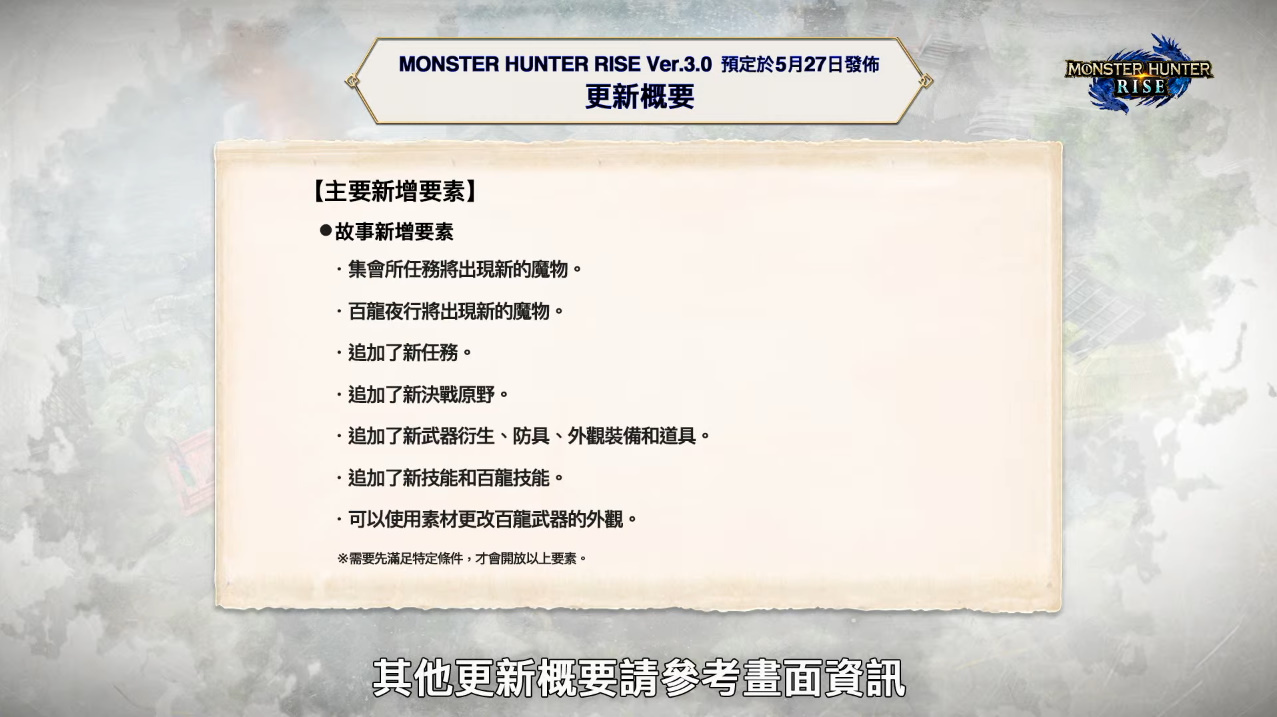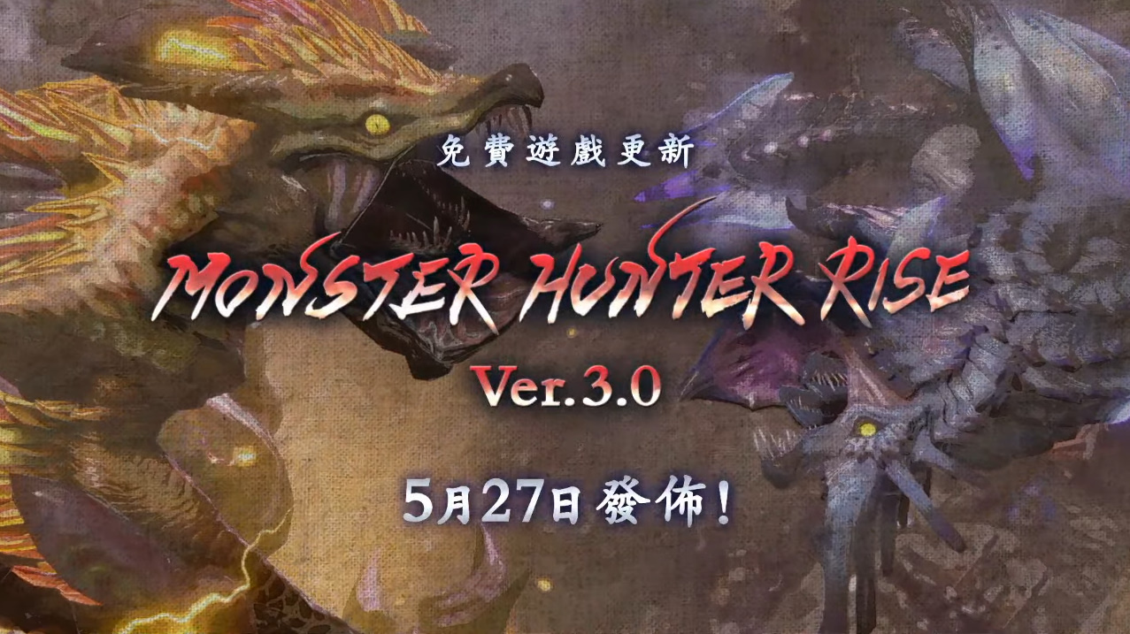 CAPCOM 於今晚的「Monster Hunter 五月特備節目」公開 Nintendo Switch 狩獵動作遊戲《魔物獵人 崛起》3.0 免費更新宣傳影片,除了將追加主線劇情結局外,將開放天彗龍變異個體「秘紅赫耀的天慧龍」、首領雷狼龍,開放更多首領魔物狩獵任務、武器防具製造,並於 5 月 27 日上線。