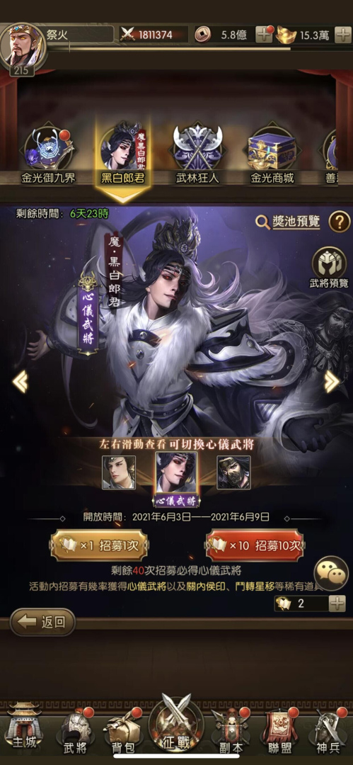 「魔·黑白郎君」的壓軸登場,也標誌著《神魔三國志》與《金光布袋戲》聯動活動即將結束,此次活動期間,將特地開啟三位聯動武將的全部獲取方式,玩家可通過在「魔·黑白郎君」的招募頁面,切換自己心儀的聯動武將進行獲取,錯過「神·史豔文」「魔·藏鏡人」的主公,可以藉此機會彌補遺憾!