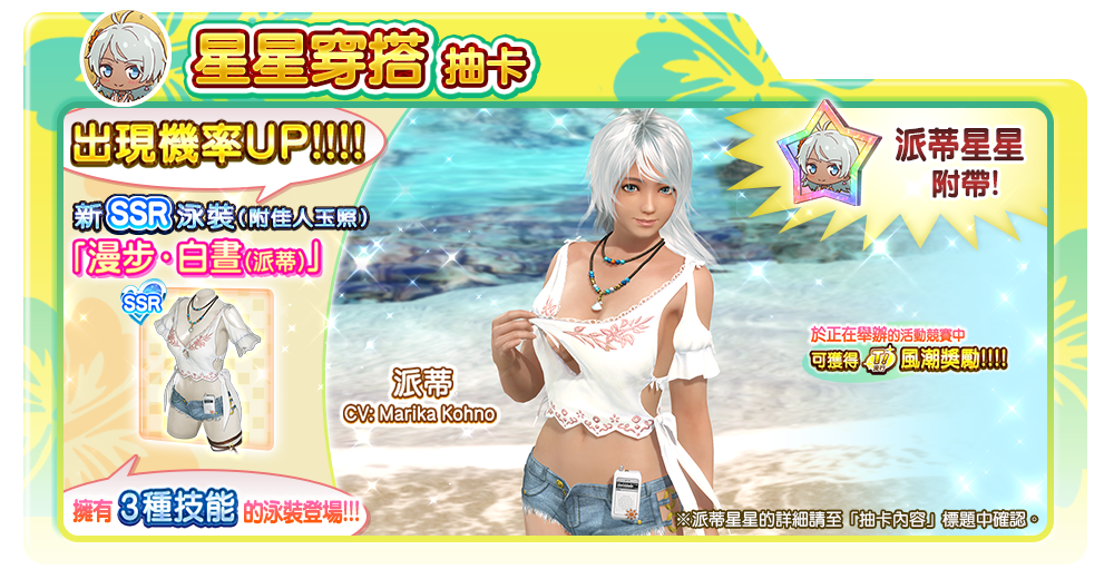 今天開始的「星星穿搭抽卡」,只要獲得新 SSR 泳裝「漫步‧白晝(派蒂)」就可招待「派蒂」至島上。此外,抽卡還可額外獲得「派蒂星星」。集滿 200 個「派蒂星星」即可兌換 1 套派蒂専用 SSR 泳裝。