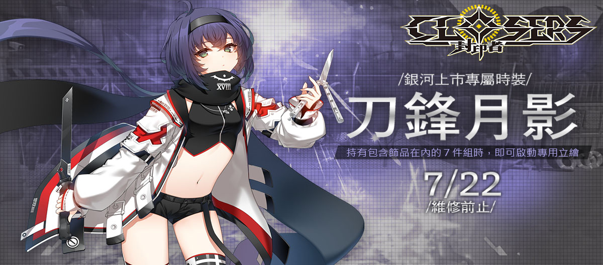為了迎接銀河的登場,官方特別推出專屬於銀河的「刀鋒月影」時裝,俏皮可愛中又帶點性感,搭配雙手持有的刀劍武器,可見銀河富有追債追到天涯海角的決心。特工如持有七個部位飾品時,還可啟動特殊專屬立繪,帶著華麗但不失殺氣的勁裝,與銀河一同享受追債人的刺激快感!