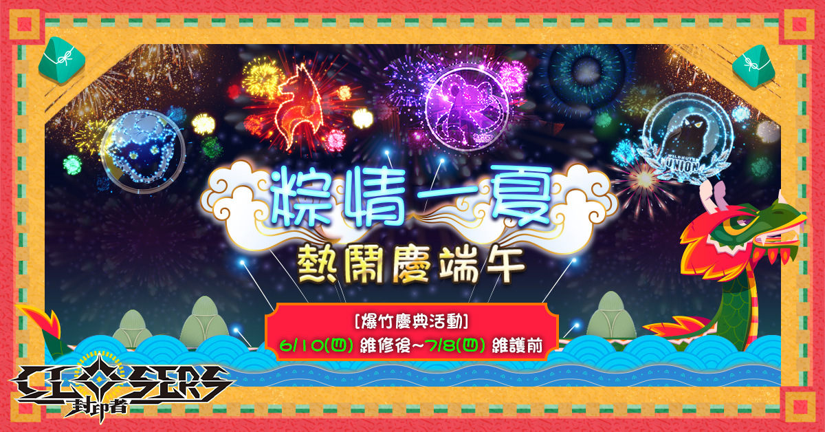 本次維護後,同步推出「端午節爆竹活動」,玩家可透過商城或於遊戲內獲得爆竹,可依使用的爆竹等級獲得慶典點數,並於角色及伺服器上累積。根據累積於伺服器的「慶典點數」,在全伺服器套用「爆竹增益」,最多可累積至 10 等級,等級越高就會提供越好的增益。並將根據角色累積的「慶典點數」計算排名,於維護後發放獎勵給前 5 名的玩家。除了施放煙火將獲得積分外,也會額外獲得「慶典信物箱子」,可利用慶典信物兌換端午爆竹限定的製作機一覽物,其中可獲得「UNION 學院 B 型(無期限) 」、「強化氣防護劑」以及「強化燃料+13」等實用道具。另外,官方粉絲團也將舉辦相關好禮活動,更多精彩內容,請詳見官方網站及粉絲團公告。