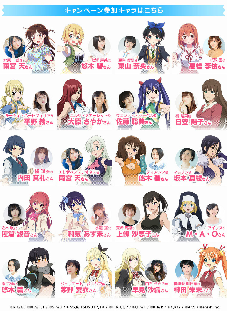 至於這次的改編遊戲,除了將會收錄原作《出租女友》的女主角們如水原千鶴、更科瑠夏、櫻澤墨等登場外,還將會收錄包括《魔導少年》的露西與艾爾莎、《家有女友》的橘陽菜與橘瑠衣、《七大罪 憤怒的審判》的瑪琳與伊莉莎白、《女友成雙》的佐木咲與水瀬渚、《炎炎消防隊》的艾莉絲、茉希尾瀬與環古達、《寄宿學校的茱麗葉》的茱麗葉、《山田君與7人魔女》的白石麗、《魔法老師 Anime Final》的神樂坂明日菜等,合計共九款作品 20 名女主角與全語音的方式登場!