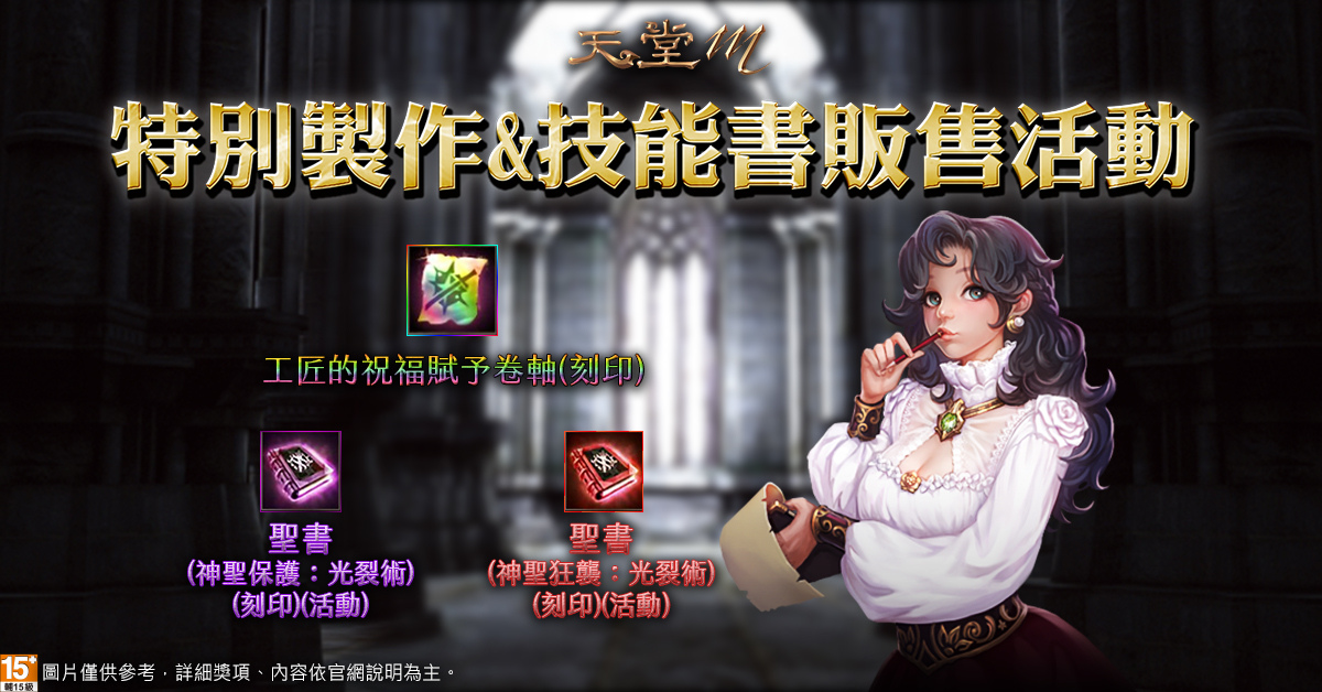 特別製作活動【工匠的祝福賦予卷軸製作活動】於遊戲系統「製作」可使用「祝福賦予卷軸」*30為材料,100%機率製作「工匠的祝福賦予卷軸(刻印)」道具,使用「工匠的祝福賦予卷軸(刻印)」將可以100%為武器附上祝福。