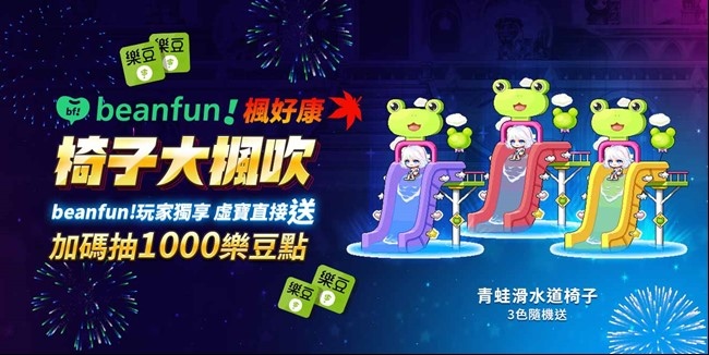 即日起至 7 月 21 日【beanfun!楓好康】活動展開,三大好康活動「椅子大楓吹」、「追楓地圖」、「主題楓變身」接連登場。首波「椅子大楓吹」活動,即日起至 7 月 7 日,玩家綁定 beanfun! 即可帶回「青蛙滑水道椅子」*1(三色隨機),還可抽千元樂豆點。「青蛙滑水道椅子」共推出三款顏色,可透過 beanfun! 的「背包交換中心」跟其他玩家交換顏色。持續追蹤活動,後續可取得首款 beanfun!「新楓之谷 NEO 改版紀念主題包」,以及更多獎勵等待玩家收藏。