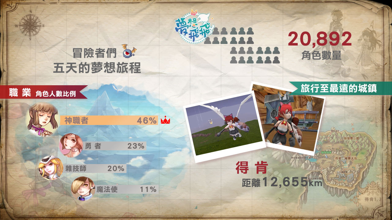 本次封測一共吸引超越兩萬名玩家參與,而開放的四個職業中,最受玩家青睞的一轉職業為無時無刻都在散播愛的「神職者」,擁有超過四成玩家選擇;其次則是具備帶領團隊殺出生路的氣魄,極其擅長近身肉搏的「勇者」。周末晚間舉行的「畢業嘉年華」,更是一度讓伺服器擠得水洩不通。一連串的 BOSS 突襲,讓搶先加入測試的玩家們,也能體驗到推王、搶王的緊張氛圍!雖戰況激烈且困難重重,許多飛行者們也表示在本次活動中,找到了當年一同闖蕩世界的夥伴、更認識了更多新的戰友。
