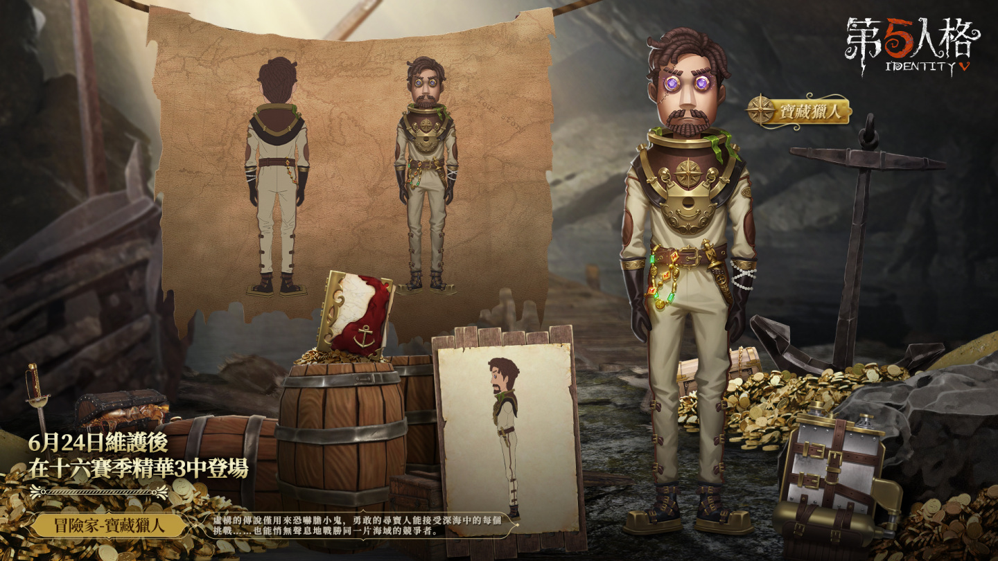 冒險家奇珍時裝「寶藏獵人」,全身帶著海中裝備,背包中有著可在海中救命的氧氣,頭套看似隨時可變成氧氣罩,腰上的匕首可用來對付海中異獸,如果發生海上意外,他肯定能成為最終存活下來的人!