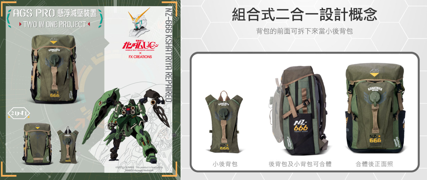 以後背包的形式做設計,前方小後背包為運動水袋,可獨立拆除使用,也可結合在後背包上,喜歡登山的鋼彈迷,一定要擁有一個!