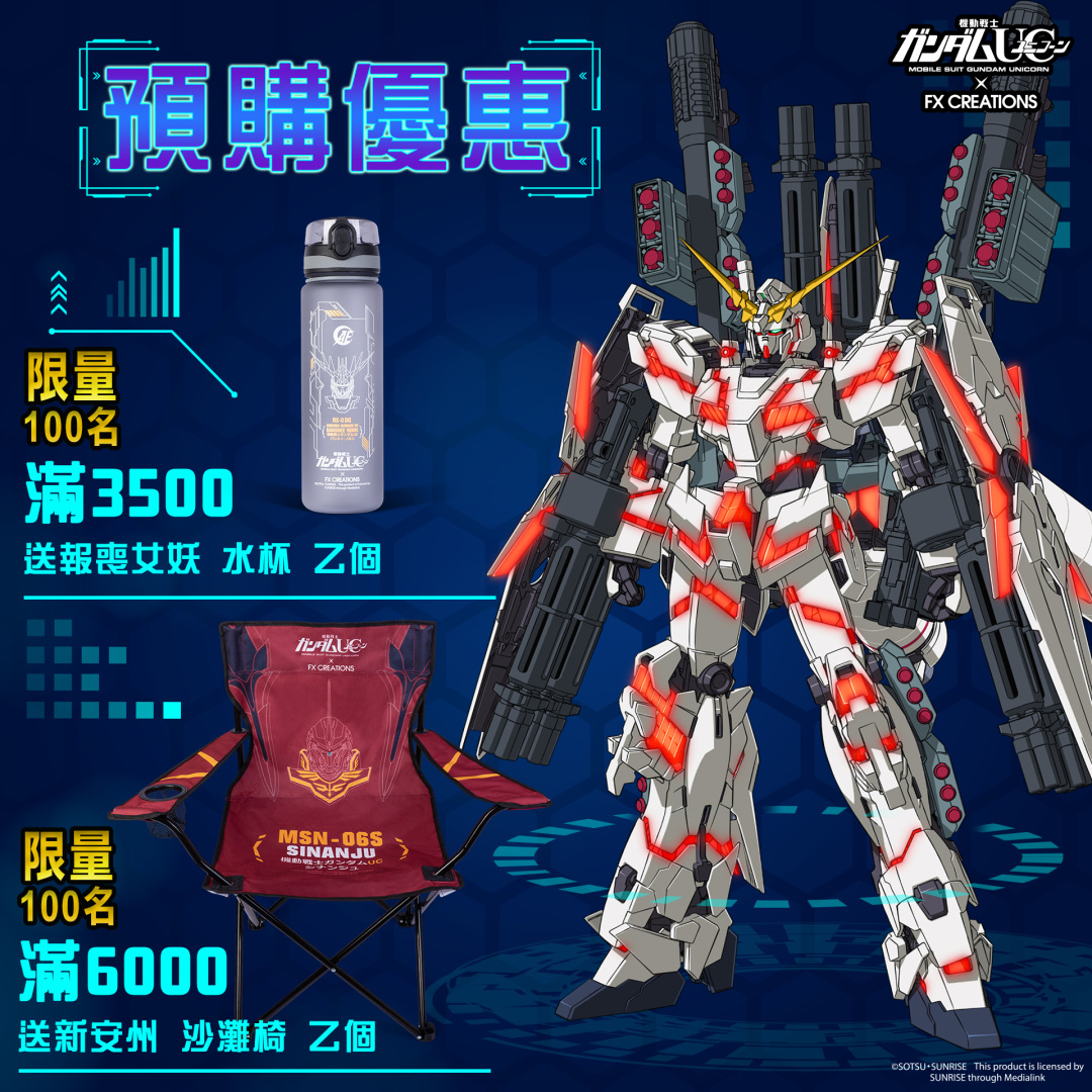 預購福利一樣有,限定 FX Creations 鋼彈新品,滿 3500 送報喪女妖水杯乙個,滿 6000 送新安州沙灘椅乙個,這麼好的預購優惠,只在 FX Creations!