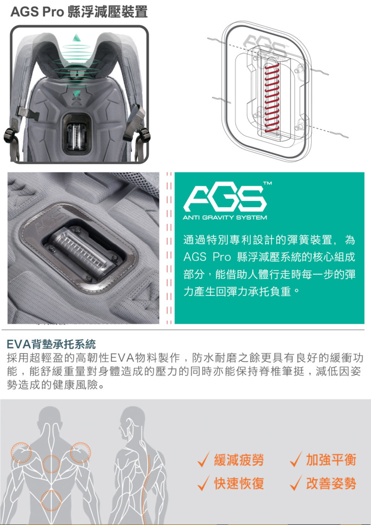 後背包均備有由 FX Creations 所研發的 AGSTM Pro 瞬間懸浮減壓系統,把專利研發的彈簧減壓裝置嵌入背板上,此 AGS 獨家專利技術,經測試證實能借助人體行走時產生的回彈力有效地承托負重,切實感受到背包瞬間懸浮所帶來的無壓體驗!
