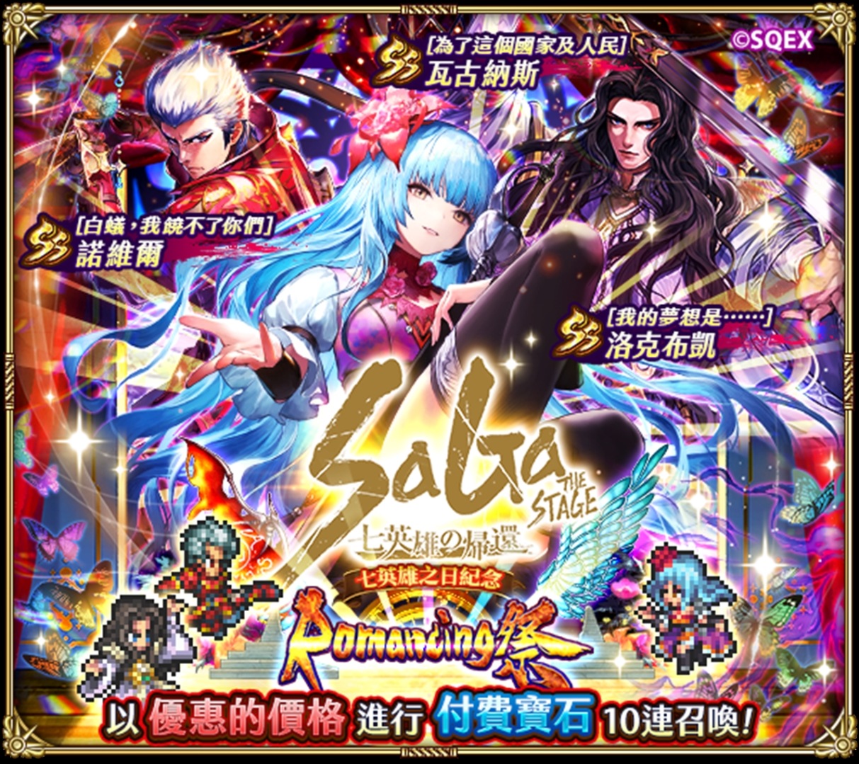 而重頭戲的召喚活動,則是由人氣角色「洛克布凱」引領的「Romancing 祭 七英雄之日紀念」!玩家有機會獲得新登場的風格* 「SS[我的夢想是⋯⋯]洛克布凱」、「SS[為了這個國家及人民]瓦古納斯」和「SS[白蟻,我饒不了你們]諾維爾」。