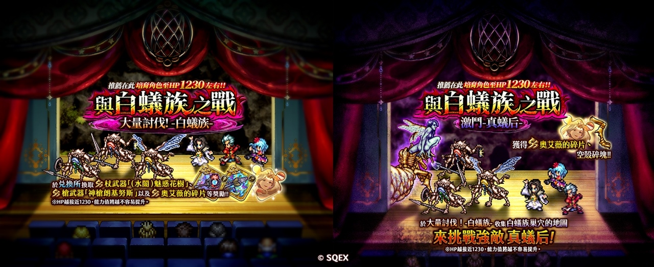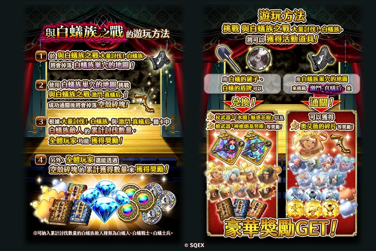 同一時間,玩家們可挑戰「與白蟻族之戰 大量討伐!-白蟻族-」活動,從中取得活動道具兌換多種獎勵,以及作為另一個關卡「與白蟻族之戰 激鬥-真蟻后」入場券的「白蟻族巢穴的地圖[期間限定]」。不僅如此,為了讓全伺服器玩家感受一同挑戰強敵的團結氣氛,只要全體玩家討伐的白蟻族敵人數量,以及「空殼碎塊」的收集數量達到指定目標,就能獲得相應的獎勵,包含寶石、金碎片、祕傳書與十分稀有的「強者的稱號.第一段」與「強者的稱號.第二段」。