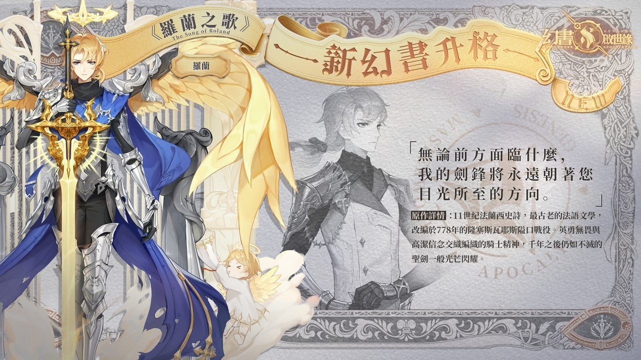 西元 11 世紀的法蘭西史詩,最古老的法語文學之一,羅蘭有著英勇無畏與高潔信念所交織而成的騎士精神,雖然性格中帶有一絲中古世紀武者特有的頑固,但仍然不影響他身為聖騎士的完美的形象。