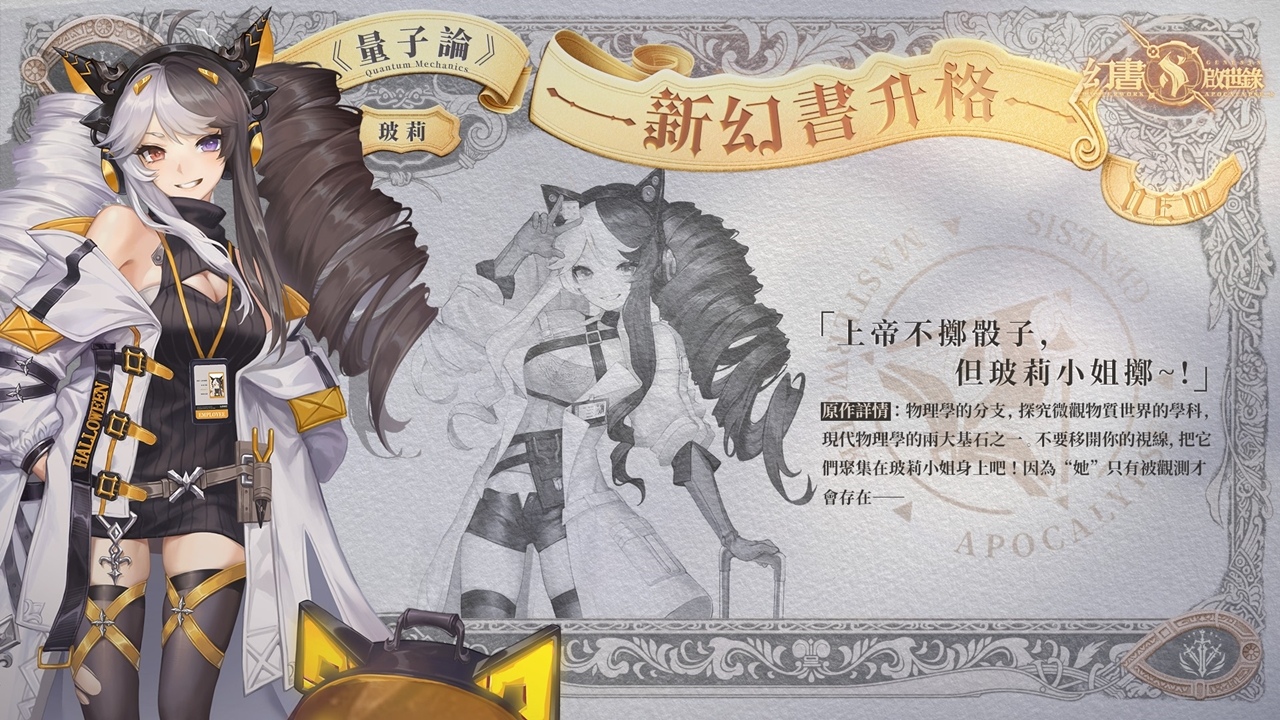 在遊戲中,量子論可以說是最年輕的幻書之一,也許是 20 世紀後才顯現的幻書,玻莉對於新穎的事物有著極大的接受度與天賦,書館中大多的幻書還在熟悉現代事物時,他已經是位小有名氣的直播主了,「千萬別把視線移開!因為玻莉小姐只有在被觀測時才會存在」他的粉絲們如此喊著。