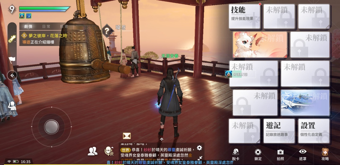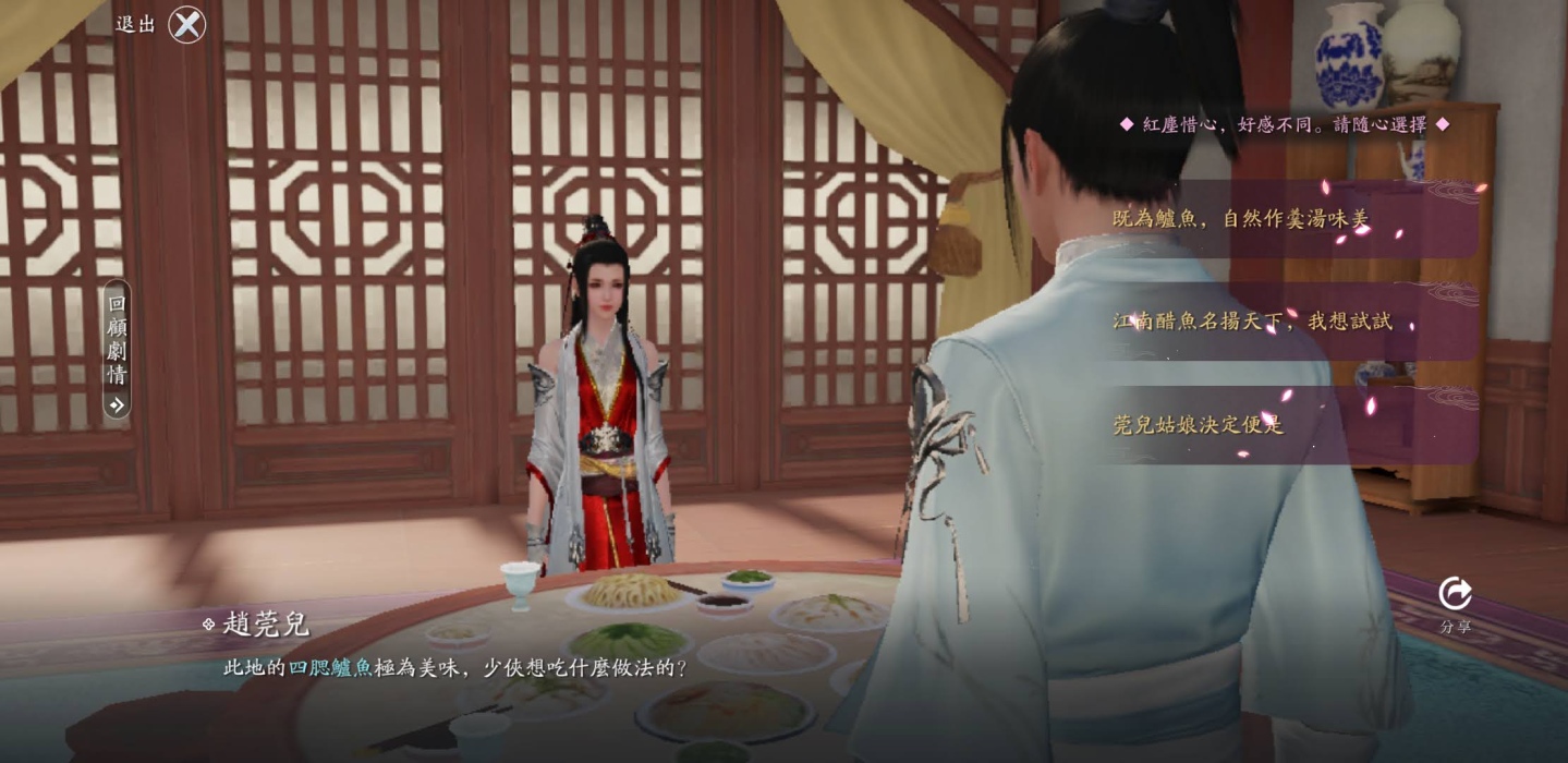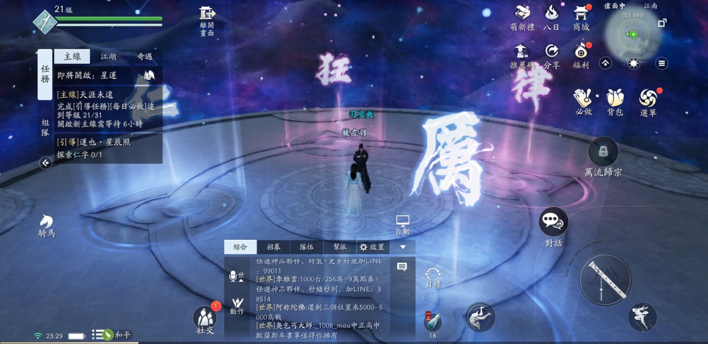 另外劇情在遊戲中佔比很重,可以說沒幾個任務就帶出一段對話劇情,除了30幾級時要衝等,開始副本的挑戰。但劇情本身也是很美的存在,可以看不同角色的造型、服裝的表現、動作的細緻,而對話的選擇,會依照不同答案增加不同屬性,如選擇有禮貌地回答,會提升「仁」,若獨斷的回答,會增加「厲」,並相互消長,玩家可以依照自己喜好選擇看看,而這些問答會性格養成,未來會對劇情發展有一些影響,每一章節也會總結與統整玩家屬性紫微星象走向,值得一探究竟。