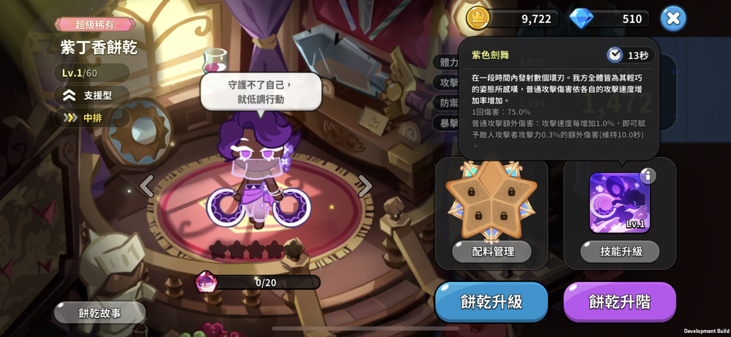 屬於支援型的紫丁香餅乾,彷彿愛情的靈丹妙藥一般,越夜越誘人,當夜霧降臨將展現真正面貌,它會捉摸不定地在散落的花瓣中現身,瞬間又像海市蜃樓般消失,無人能捉摸他的身影,輕巧而優美的紫色劍舞,能在一段時間內發射數個環刃,讓敵人迎戰時常措手不及,同時加成我方全體普攻速度,給隊伍帶來極大的幫助,玩家們千萬別錯過風姿綽約又無情的美麗殺手!
