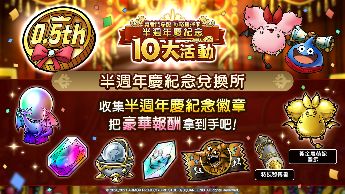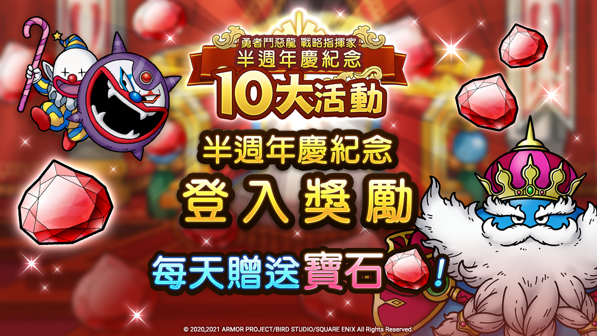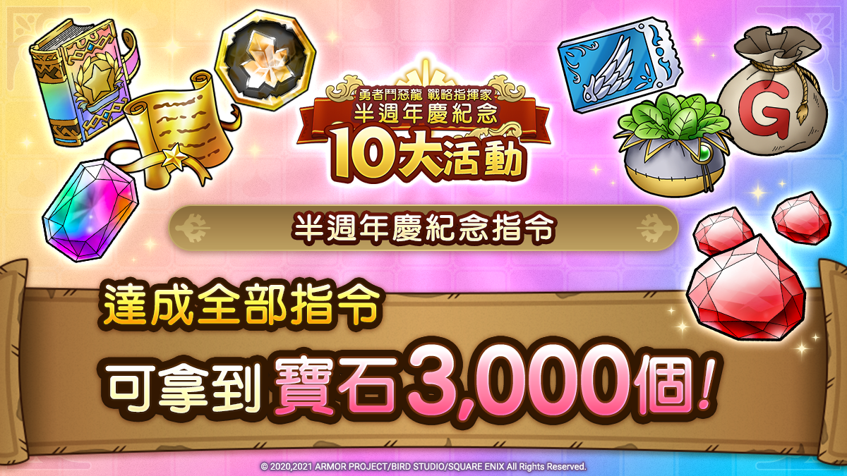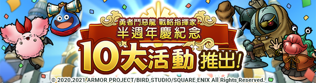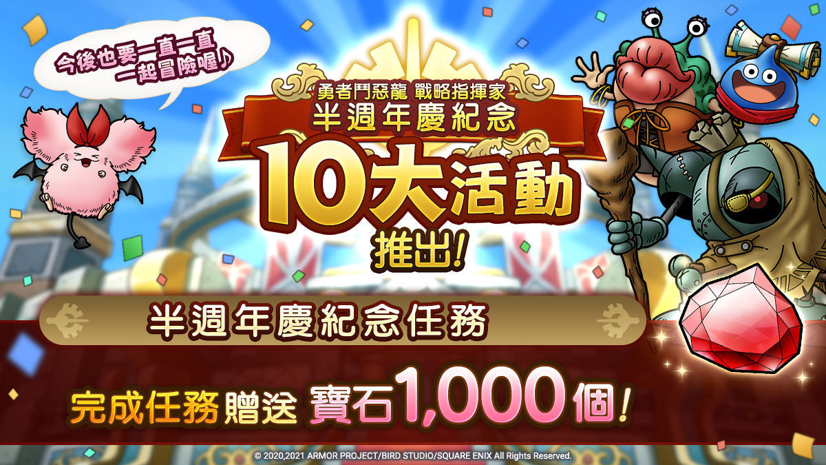 《勇者鬥惡龍 戰略指揮家》國際版自上市以來受到玩家們的熱烈支持,營運團隊非常感謝大家遊玩《勇者鬥惡龍 戰略指揮家》。多虧有大家支持,遊戲將迎接半週年慶。為紀念迎接半週年慶,營運團隊滿懷對各位玩家的感謝之意,現正推出「半週年慶紀念10大活動」!