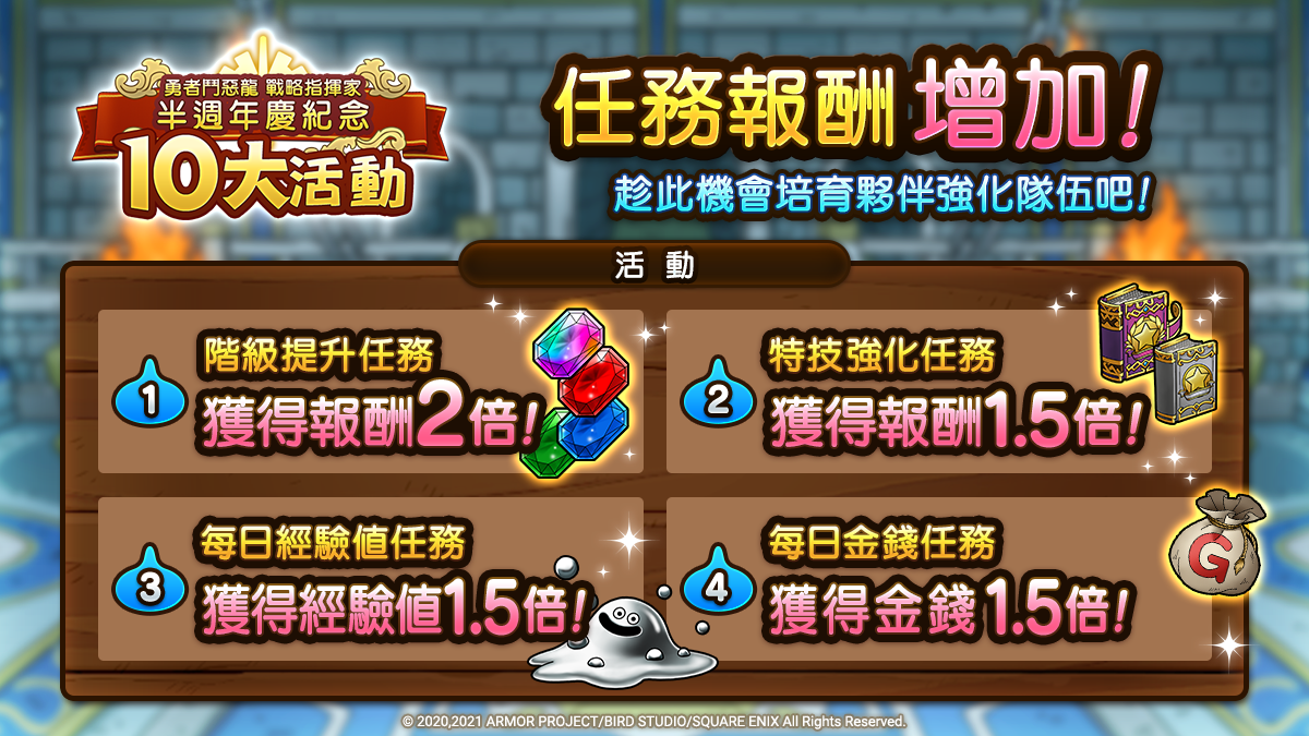 在半週年慶期間,部份任務的報酬將會大量增加,階級提升任務獲得報酬將提升到2倍,而特技強化任務、每日經驗值任務和每日金錢任務所獲得的報酬都增加到1.5倍,趁此機會多多進行任務,強化夥伴們的實力吧!