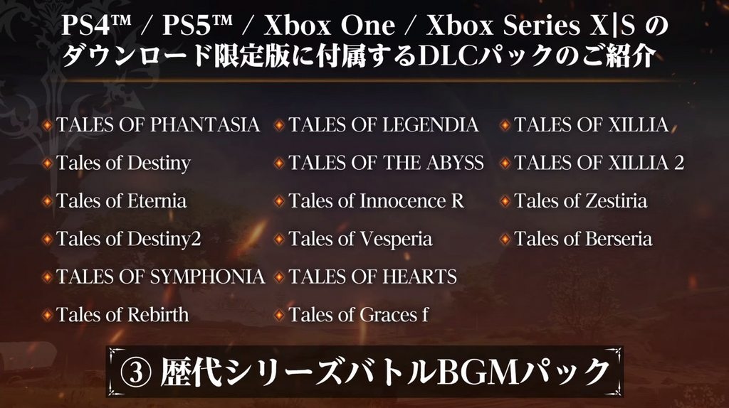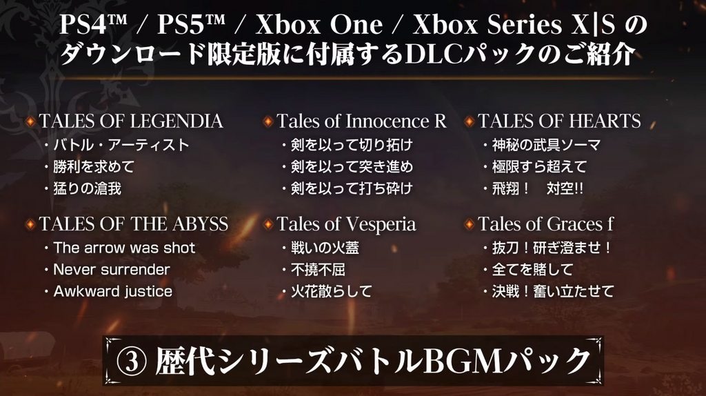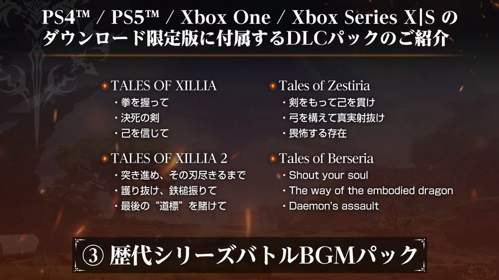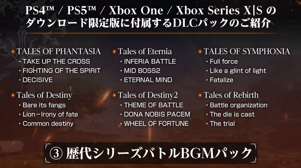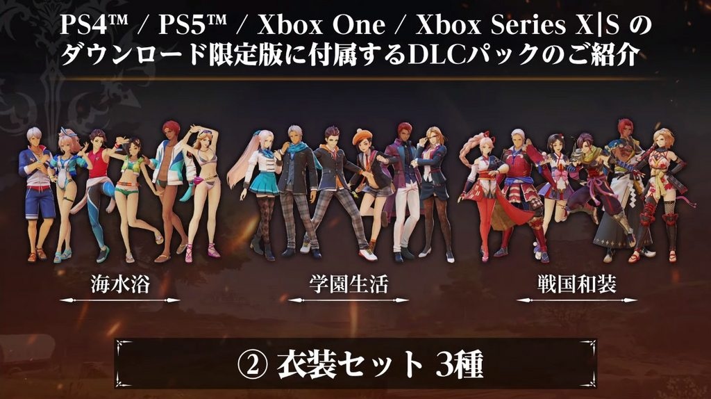 另外,本作也將會推出豐富的 DLC 內容讓玩家們下載選購,例如家機下載限定版附屬的服裝超值包與三種類型服裝組合、還有收錄系列歷代戰鬥 BGM 的音樂包等等。而且這些 DLC 預定都會開放個別販售,讓玩家們可以選擇自己想要的 DLC 來購買入手。