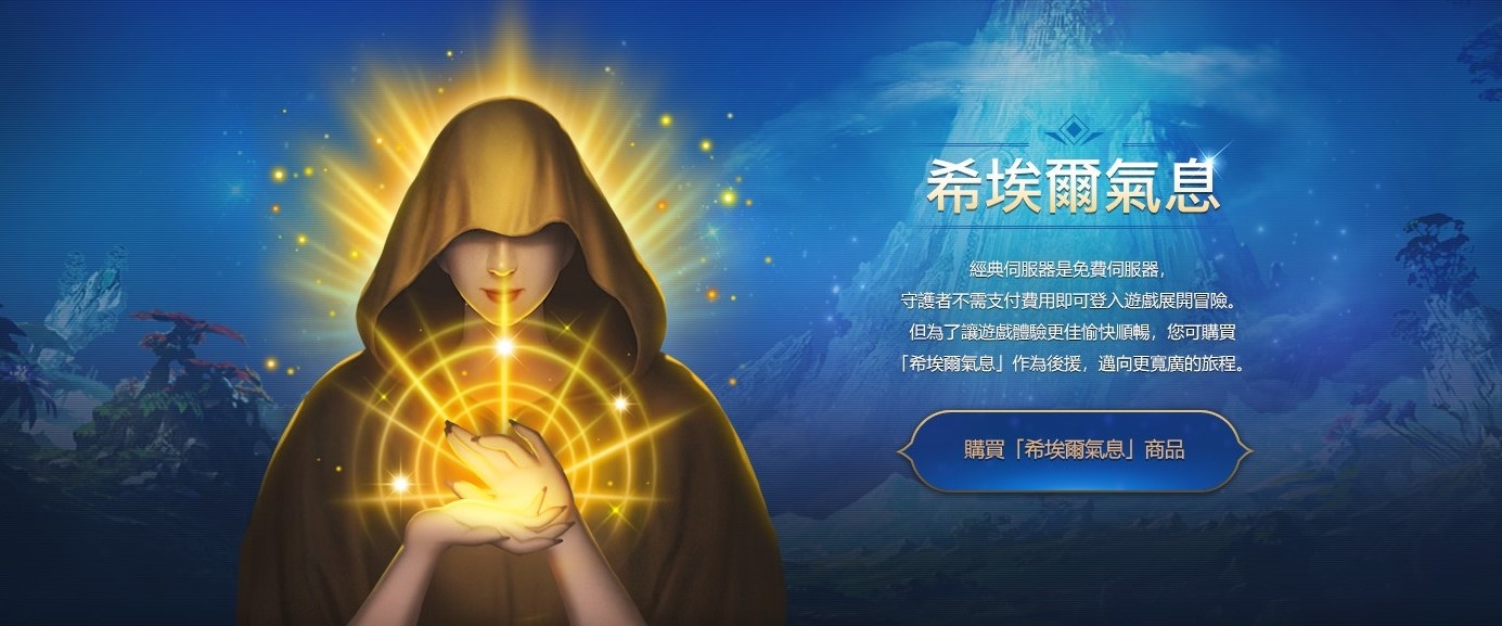 經典伺服器是免費伺服器,守護者不需支付費用即可登入遊戲展開冒險。但為了讓遊戲體驗更佳愉快順暢,可購買「希埃爾氣息」作為後援,邁向更寬廣的旅程。以上午 9 點為基準,每日各帳號免費提供一小時希埃爾氣息,購買希埃爾的氣息使用券則可常態套用。為了讓守護者能有更完整的遊戲體驗,自 2021.08.04(三)維護後~2021.08.11(三)維護前,角色登入遊戲將自動獲得希埃爾的氣息。