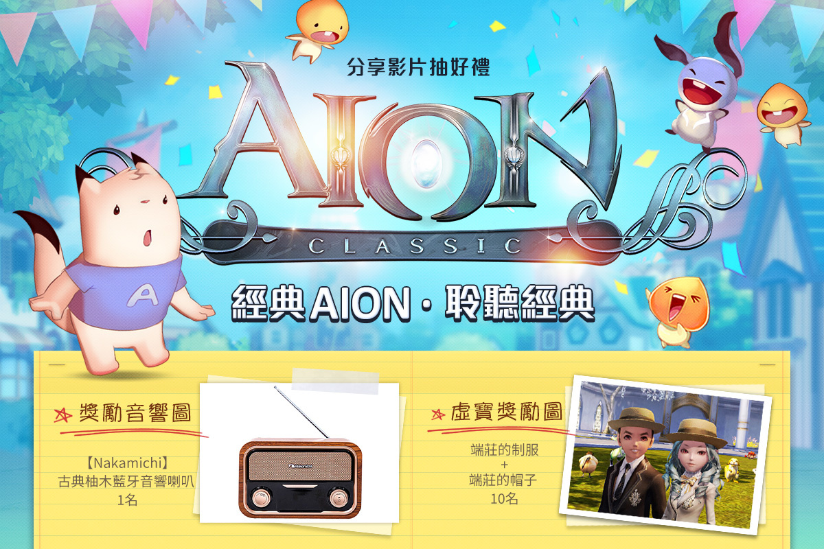 【經典AION 聆聽經典】:8/4~8/17 活動期間內,至官方粉絲專頁欣賞「經典伺服器OST」音樂影片,並完成指定任務就有機會獲得虛寶獎勵「端莊的制服」、「端莊的帽子」以及實體獎勵「古典柚木藍牙音響喇叭」。
