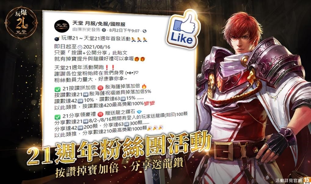 首先,天堂粉絲團「貼文互動任務」達標,最高將送「殷海薩的祝福」掉落加成 100%、「龍鑽(刻印)」1000 顆!另外還有七大活動,參加活動就能獲得「殷海薩的加護」、「龍鑽」、高等武器、高等裝備,以及消耗性資源等練功、變強必備資源!邀請所有玩家,一起玩爆21、拿爆獎勵!詳細活動細節以官方網站公告為準。