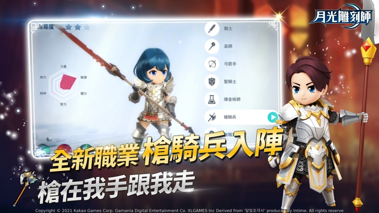 《月光雕刻師》全新職業「槍騎兵」正式登場!「槍騎兵」使用長柄武器,長柄武器是遊戲中新型態的武器,相較其他近戰職業、擁有更長技能距離;「槍騎兵」能以突擊技能快速移動到敵人身邊,並透過高倍率的暴擊傷害,致敵人於死地;弱點則是防禦技能與 BUFF 較少,需以速戰速決的方式取勝。槍騎兵技能介紹如下:
