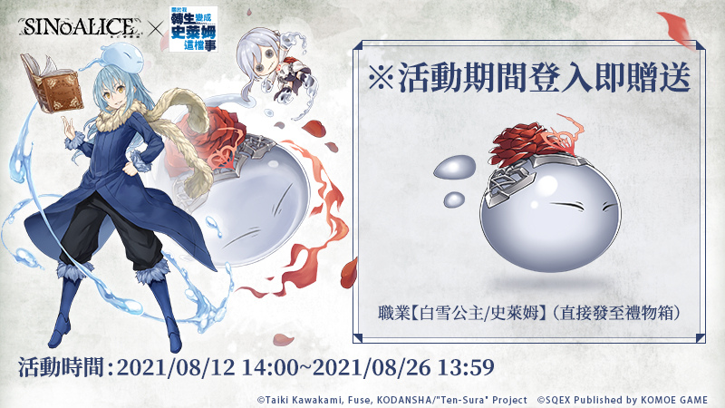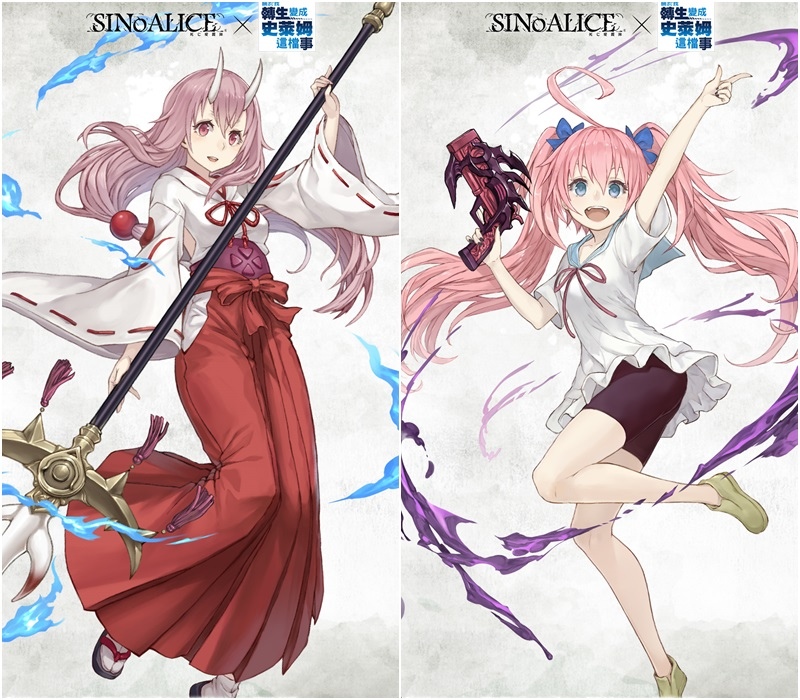 《死亡愛麗絲》x《關於我轉生變成史萊姆這檔事》聯動於繁中版限時展開,「利姆路/法師」、「靜/破壞者」、「朱菜/牧師」、「蜜莉姆/ 射手」等人氣角色強勢登場!活動期間不僅登入即送限定角色「白雪公主 / 史萊姆」,更有全新協力活動「轉生的童謠」可獲得大量聯動角色強化素材,以及全新的限定優惠禮包上架!