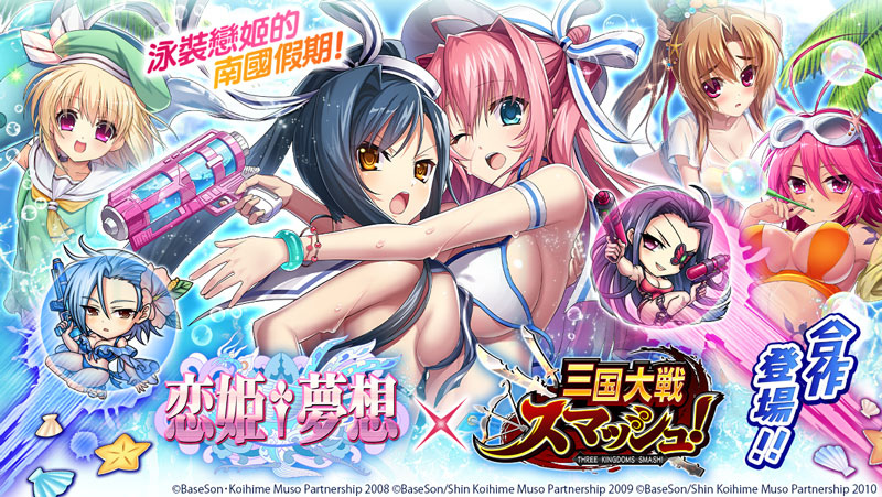 限定活動「泳裝戀姬的南國假期~飛濺海灘~」登場。在海灘舞台的降臨任務中與身穿泳裝的美少女武將們進行戰鬥吧。收集活動點數,便可透過達成獎勵來獲得新合作武將「陸遜-穏-」,或透過排行獎勵獲得霸王化8技能新合作武將「呂布-戀-」。